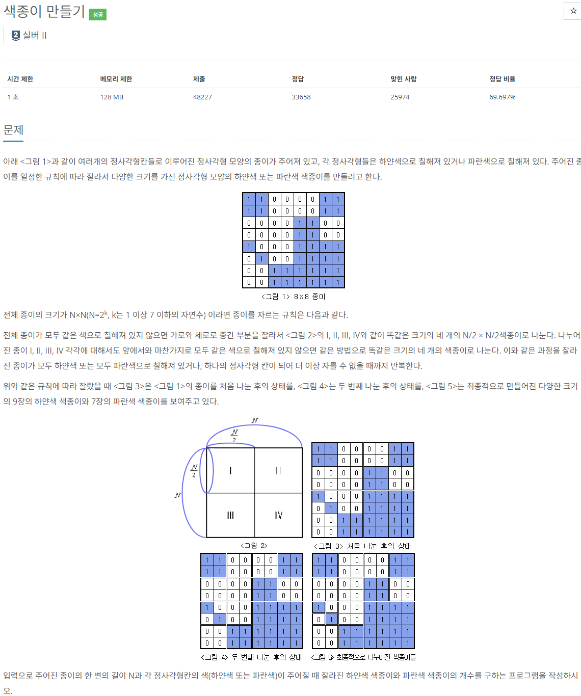 해당 문제에서 중요한 점은 매번 색종이를 반으로 나누어 새로운 정사각형 모양의 색종이를 만드는 것과 새롭게 만들어진 색종이가 완전한 흰색 색종이인지, 파란색 색종이인지, 섞여 있는 색종이인지 판별하는 것이다.
