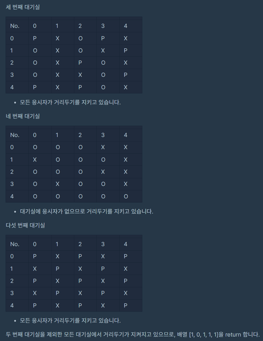 해당 문제는 각 대기실에 있는 모든 응시자가 거리두기를 지키고 있는지 확인하는 문제이다.