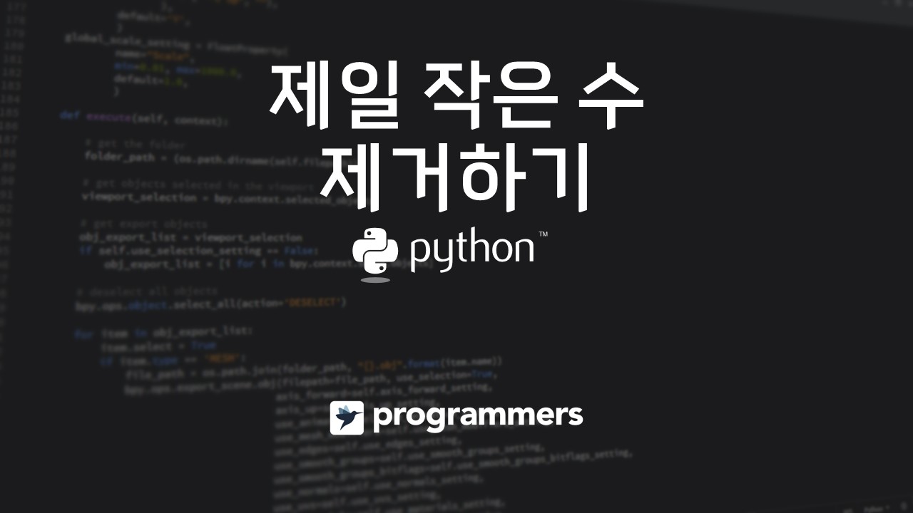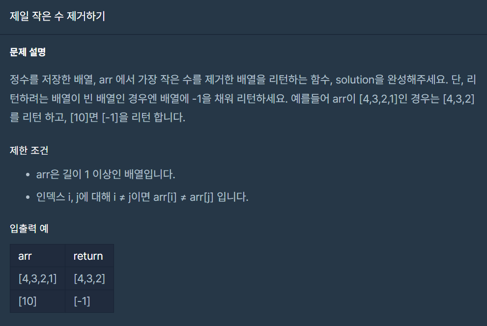 - 매개변수로 입력받은 배열에서 가장 작은 값을 갖는 원소를 찾아 배열에서 삭제한다. arr.remove(min(arr))