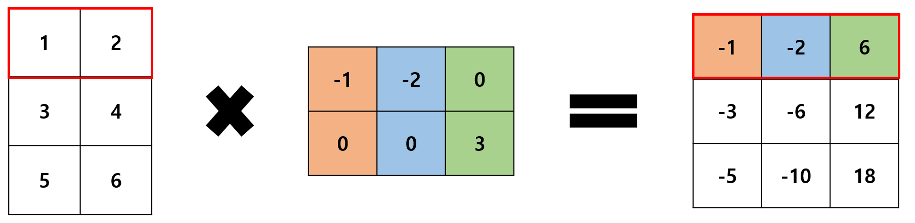앞 행렬의 첫 번째 행 1, 2를 뒷 행렬 첫 번째 열 -1, 0을 각각 곱하여 더하면 1 x -1 + 2 x 0 = -1 이 되는 것이다.