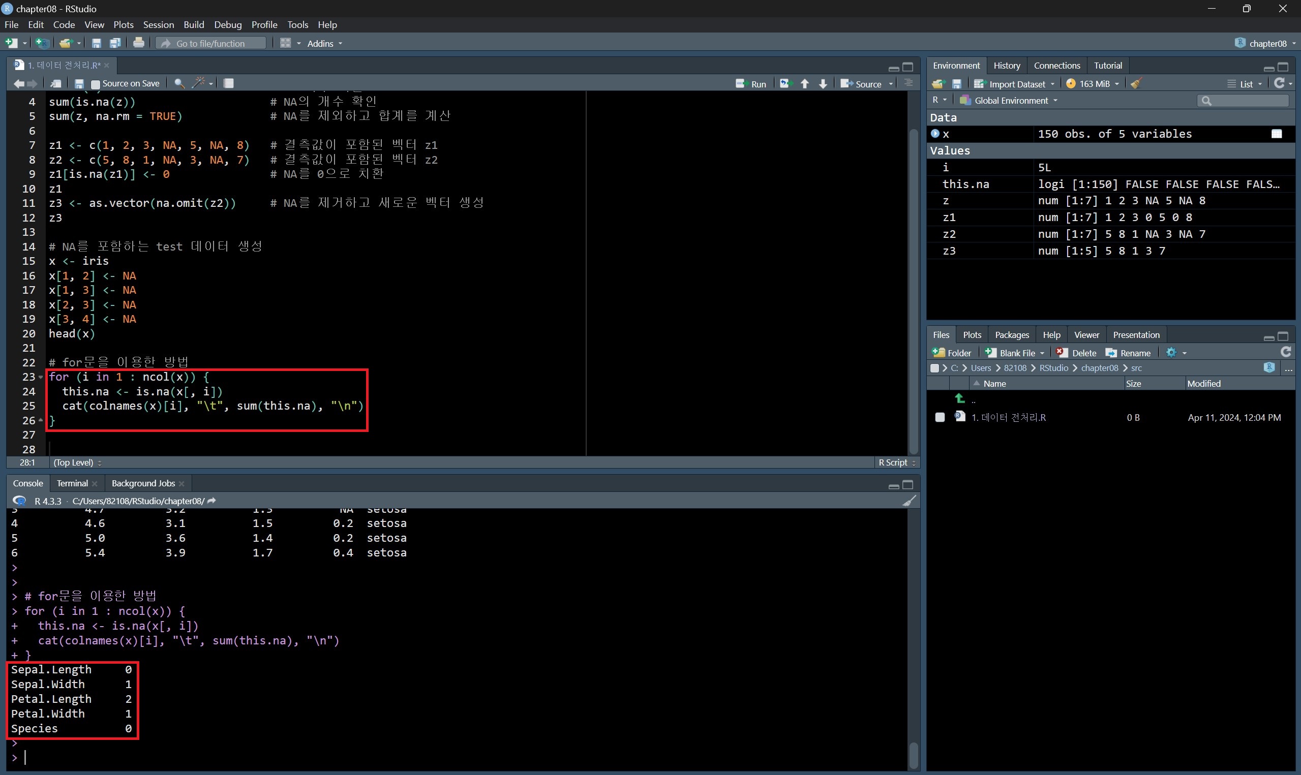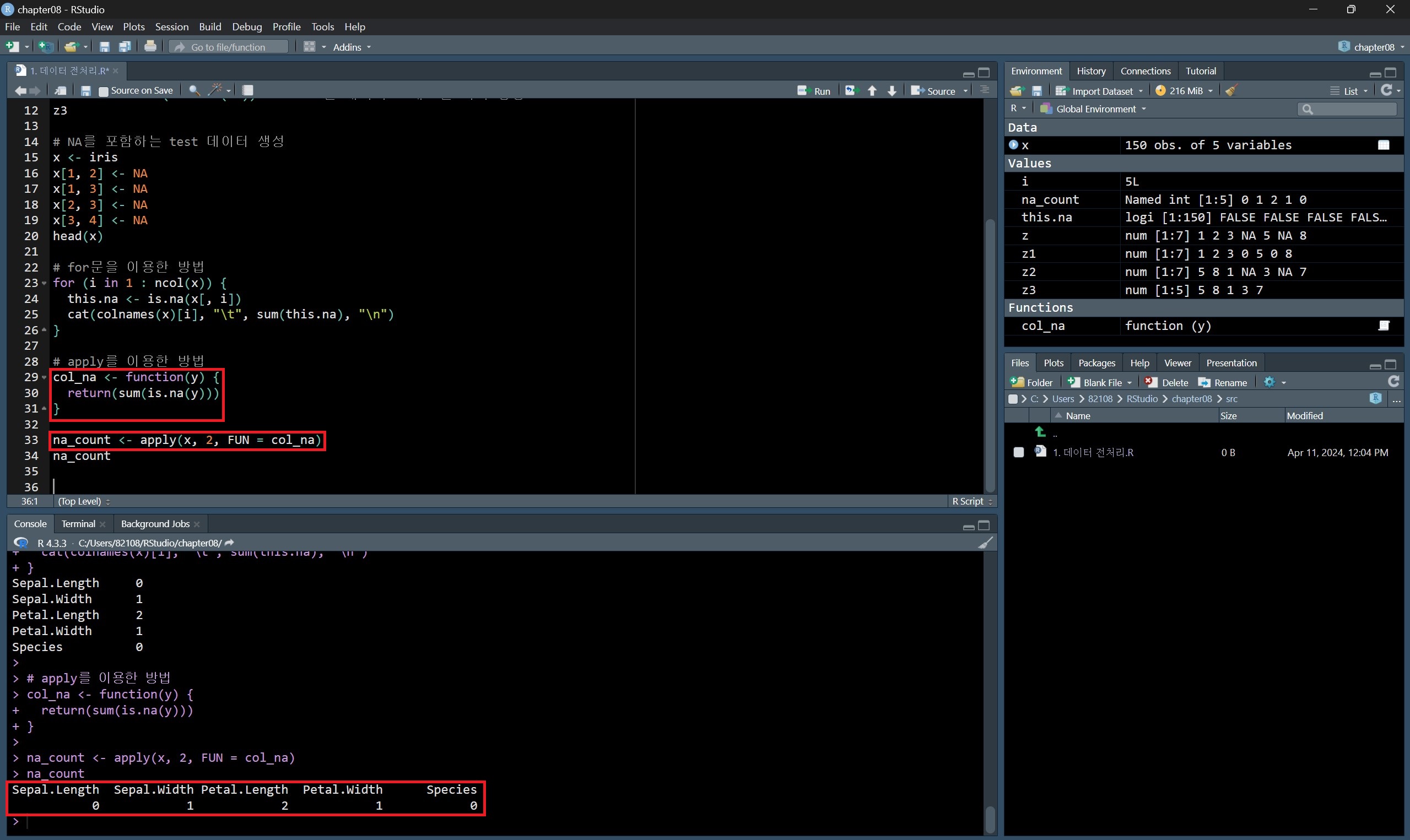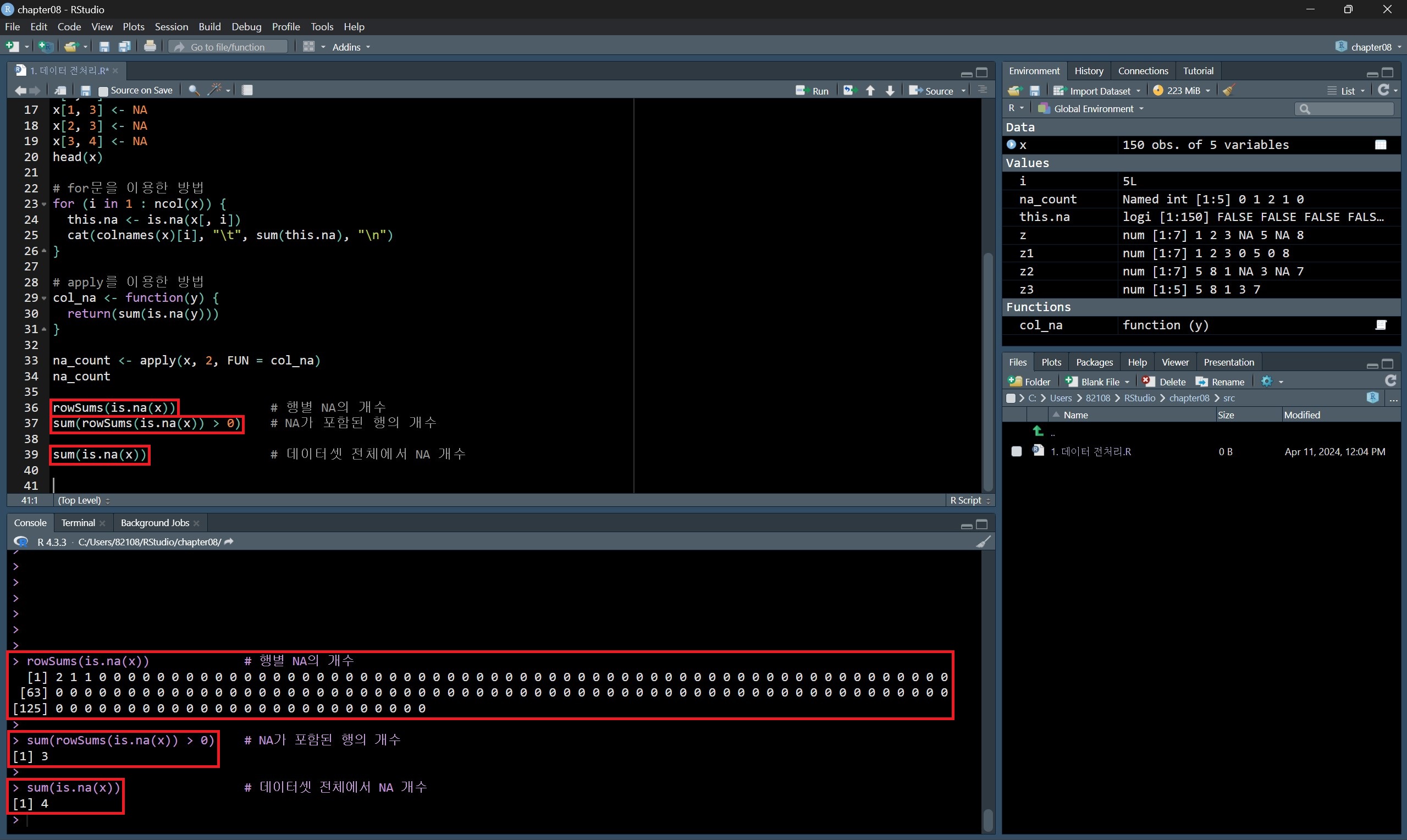 데이터프레임에 is.na() 함수를 적용시키고 이를 sum() 함수에 넣은 결과는 해당 데이터프레임 전체에서 결측값의 개수를 의미한다.