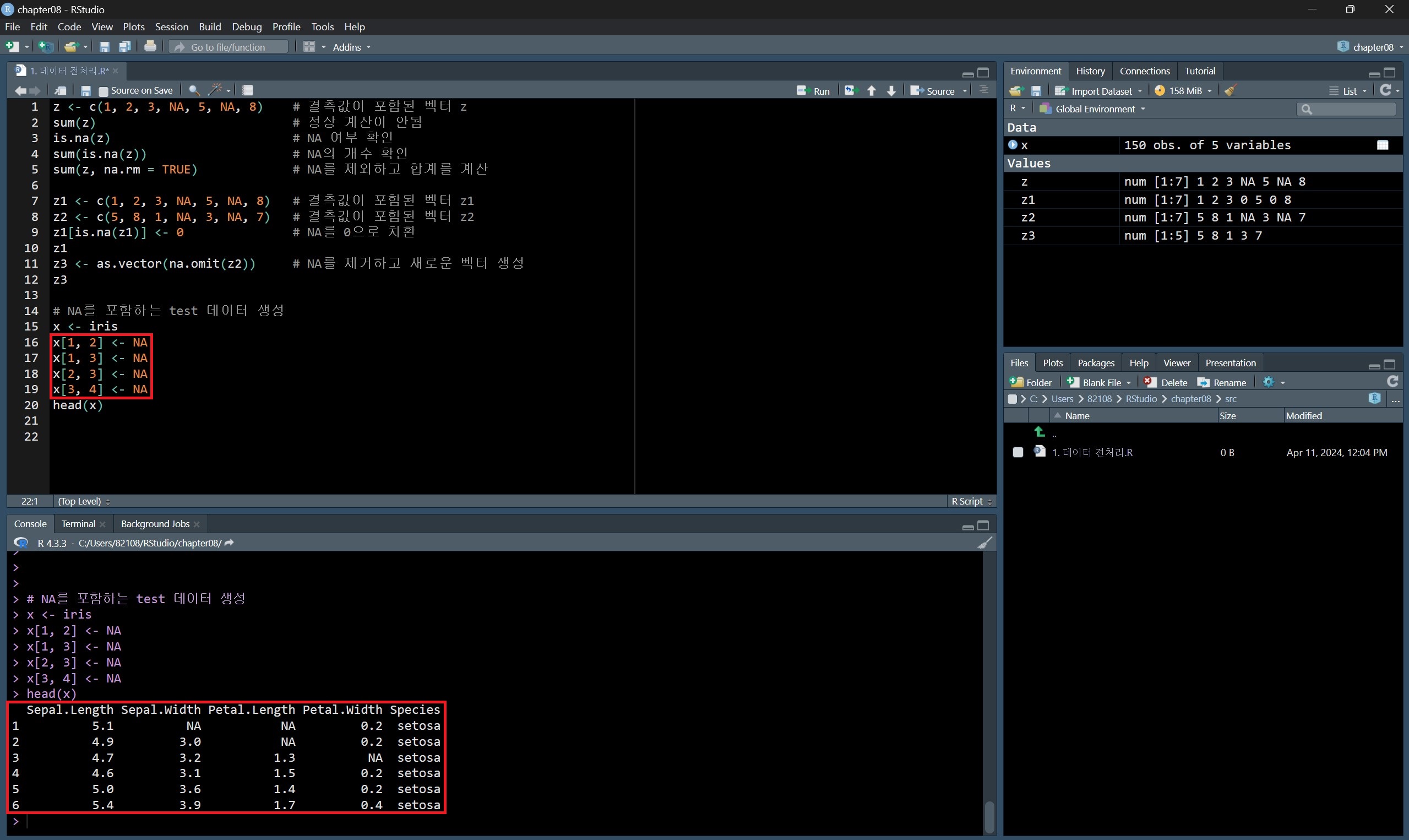 데이터프레임에서 결측값을 처리하려면, complete.cases() 함수를 활용해 결측값이 없는 행에 대한 논리값을 얻은 후, 해당 결과를 데이터프레임 추출에서 ! 연산을 붙여 결측값이 있는 행들을 추출할 수 있다.