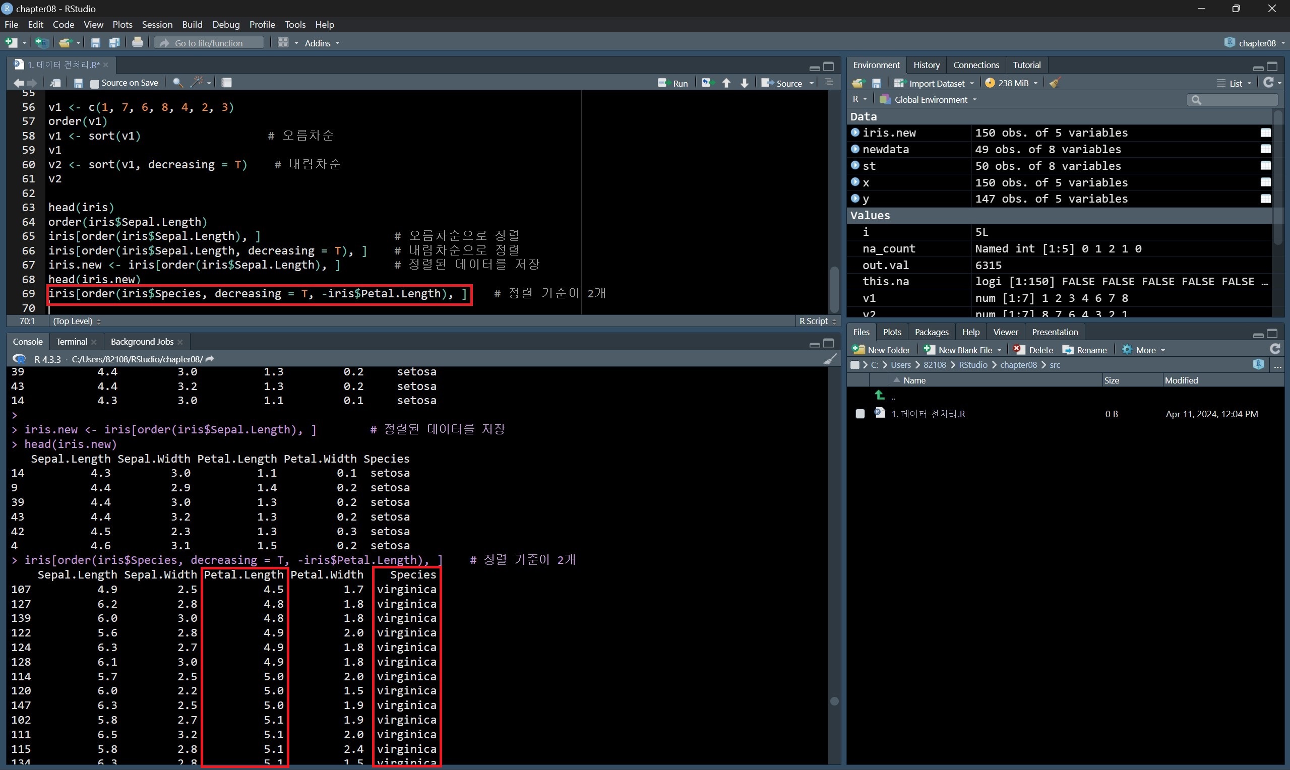 내림차순으로 정렬한 인덱스 값을 매트릭스와 데이터프레임에 적용시키면 해당 매트릭스와 데이터프레임을 정렬할 수 있다.