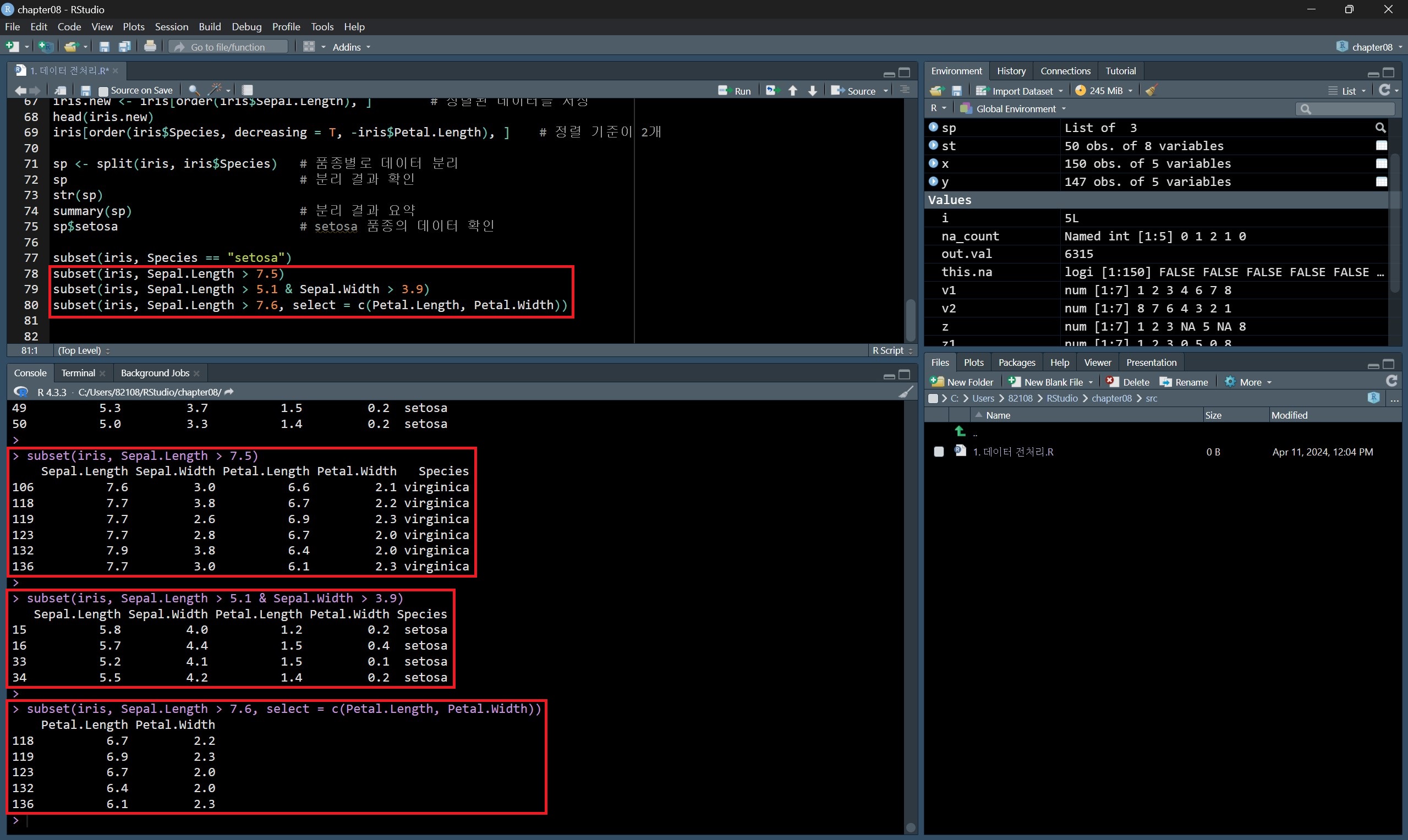 subset(벡터 or 데이터프레임, 조건) 형식으로 작성하면 해당 벡터나 데이터프레임에서 특정 조건을 만족하는 값만 선택할 수 있다.
