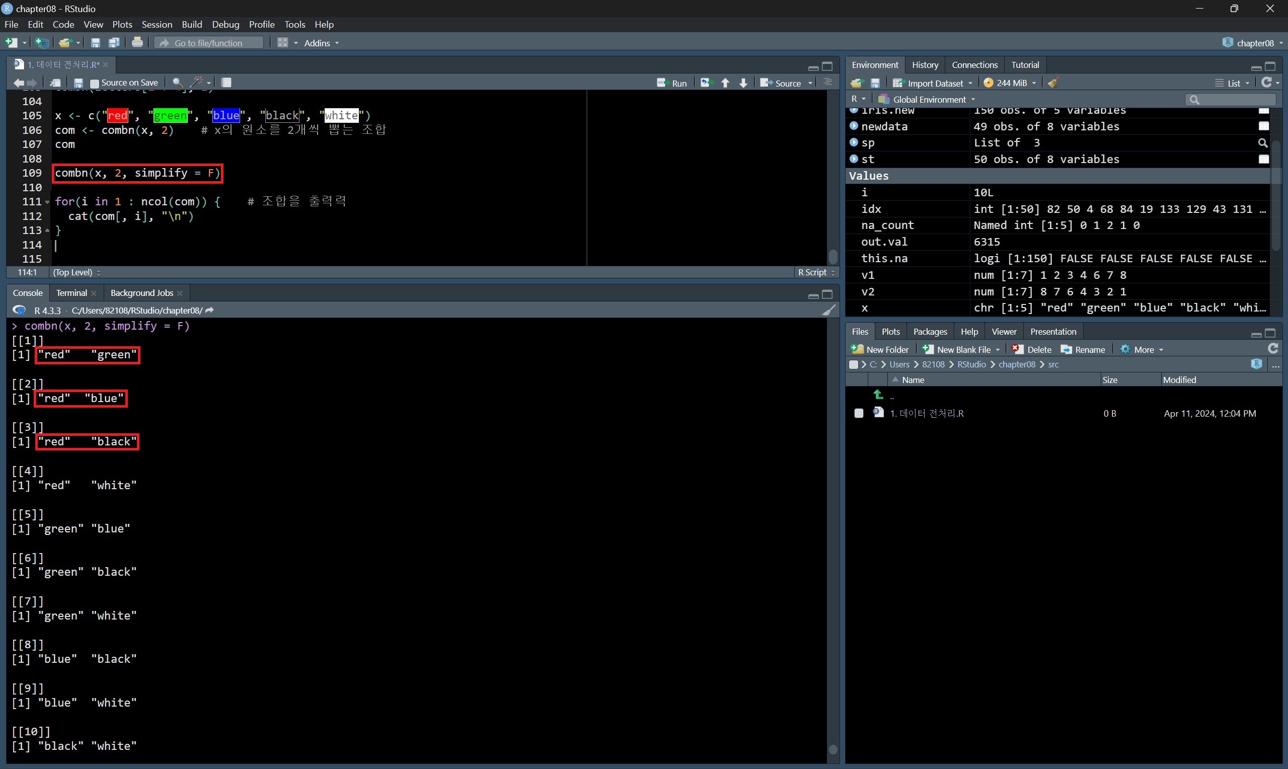 combn() 함수를 사용할 때 simplify 옵션은 F로 지정하면 결과가 가로 방향이 아니라 세로 방향으로 출력된다.