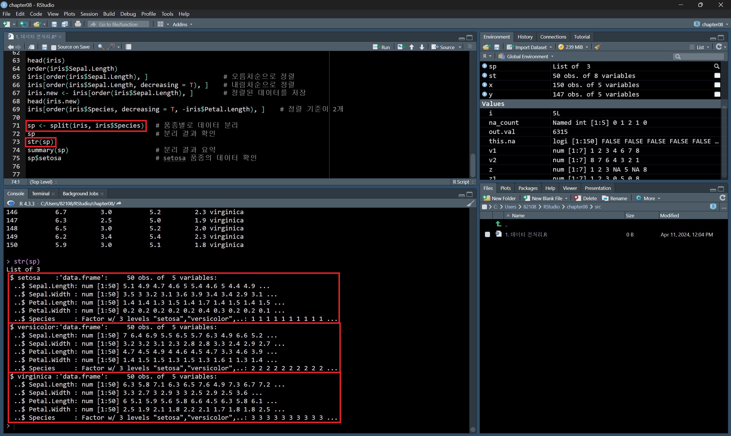 분리한 결과의 각 그룹의 칼럼 개수와 class, mode 등을 확인할 수 있다.