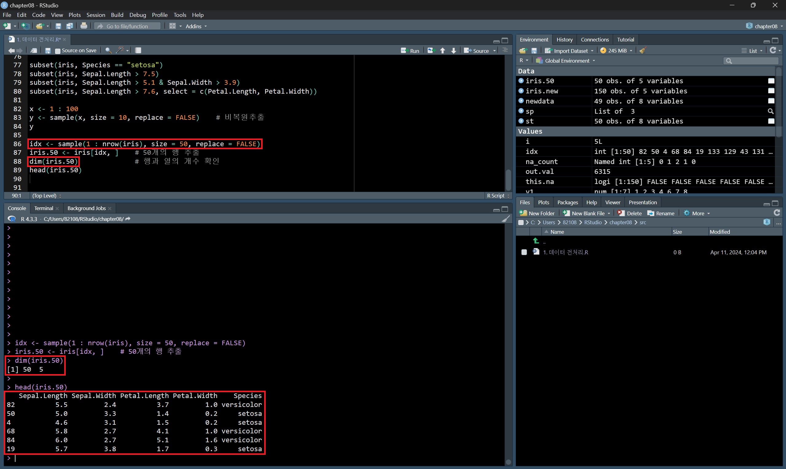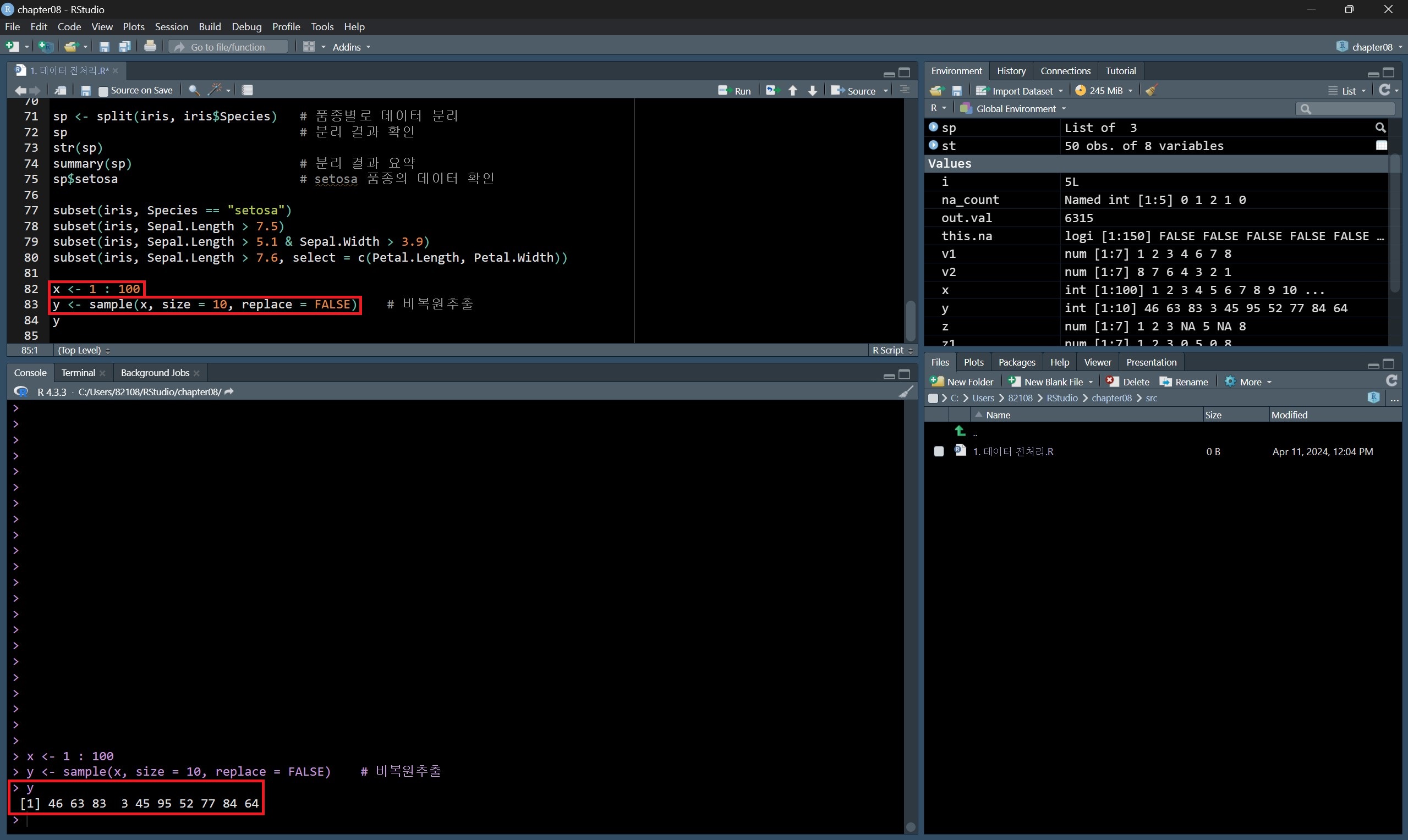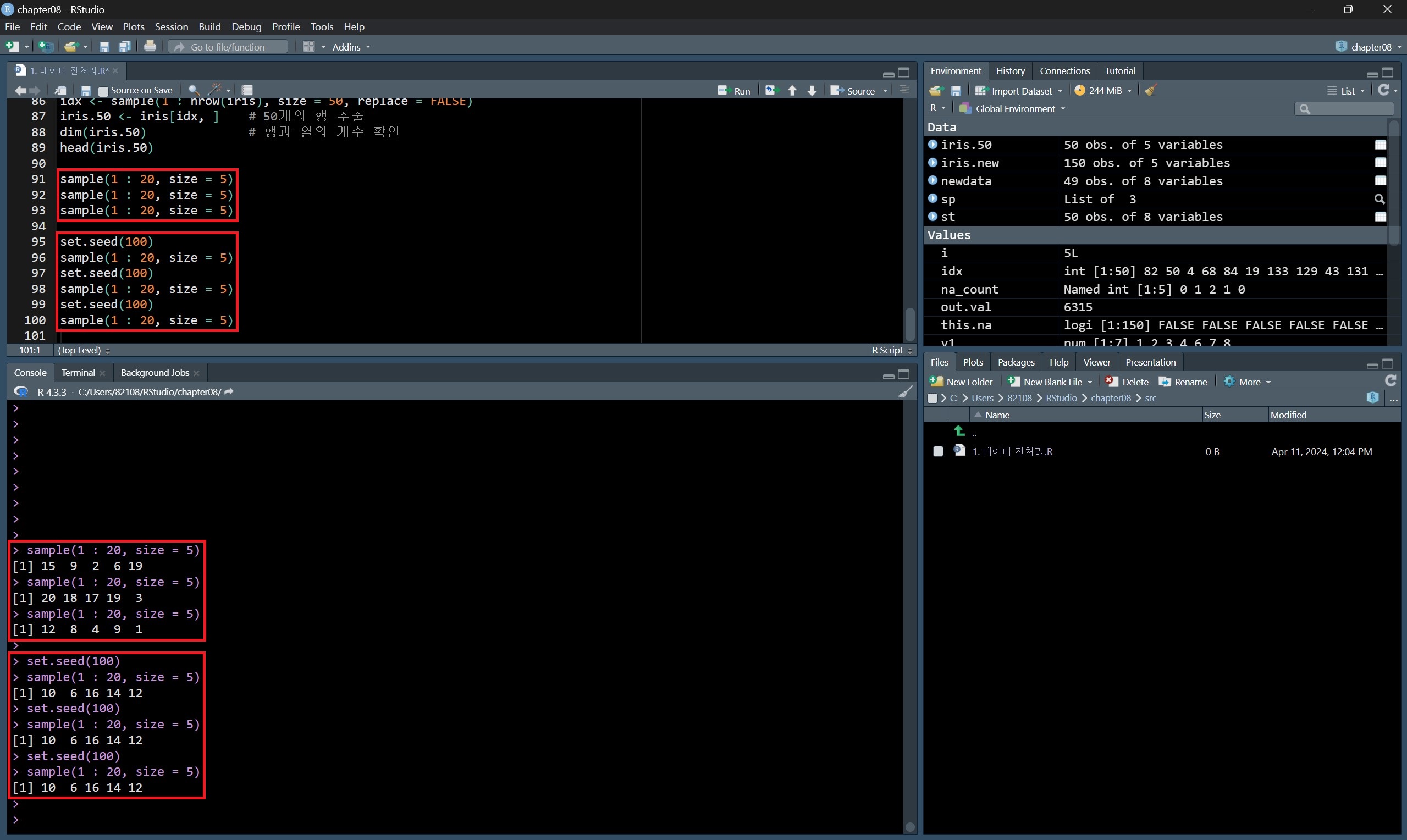 하지만 set.seed() 함수를 활용하면 매 샘플링마다 같은 결과를 추출하게 할 수 있다.