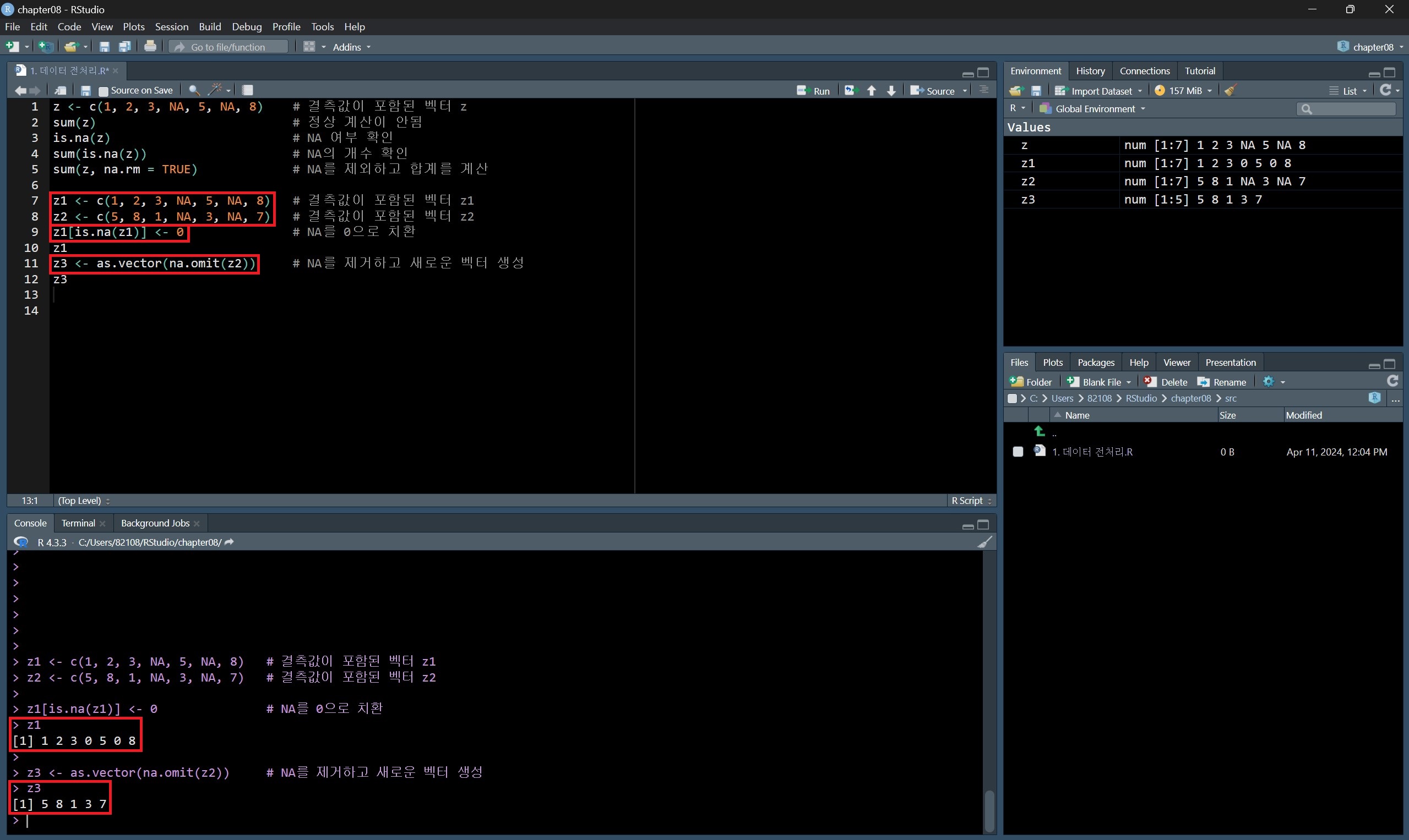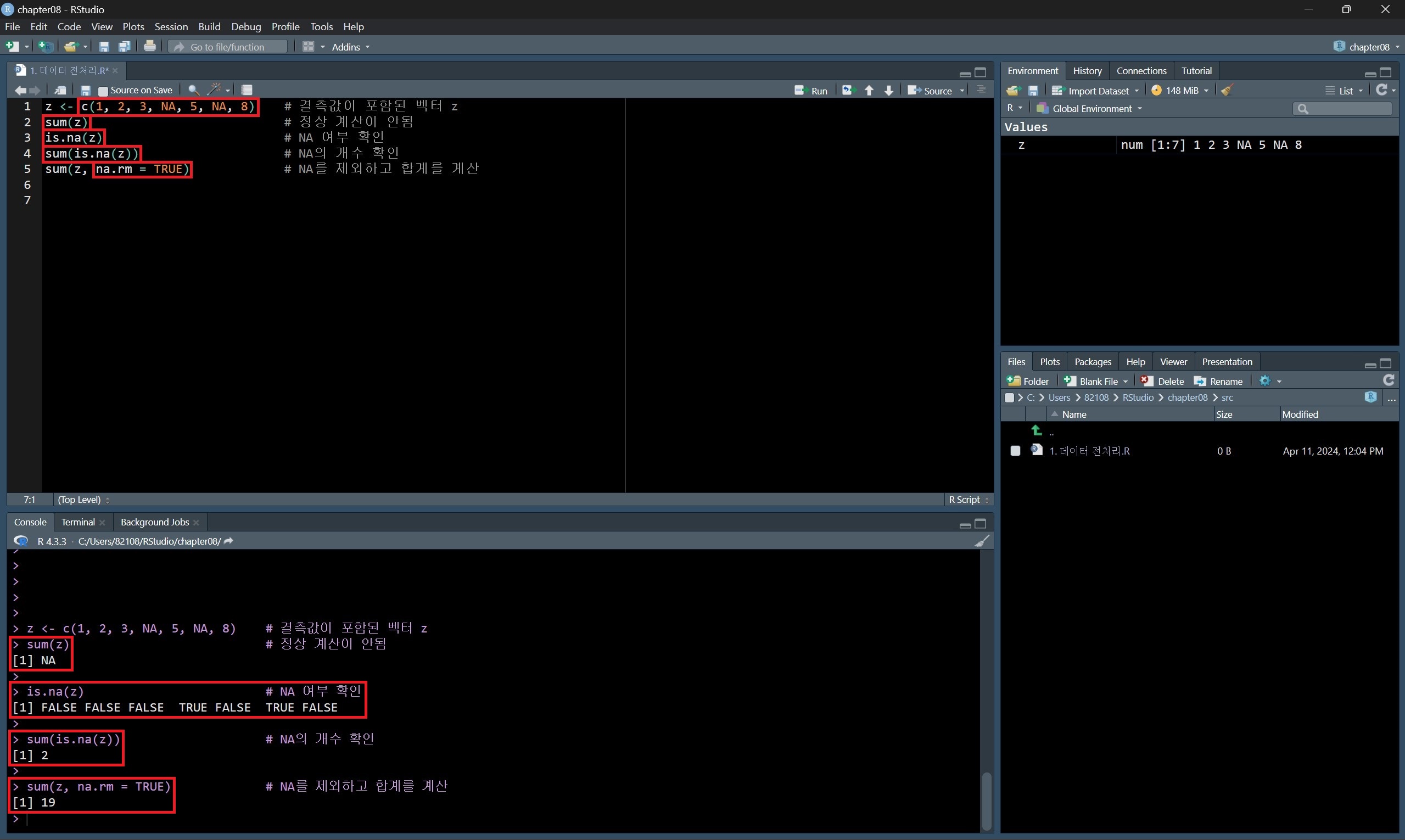 우선 결측값의 특성과 존재 여부를 확인해 보면, 결측값이 포함된 벡터의 합계 계산이 안 되는 것을 확인할 수 있다.