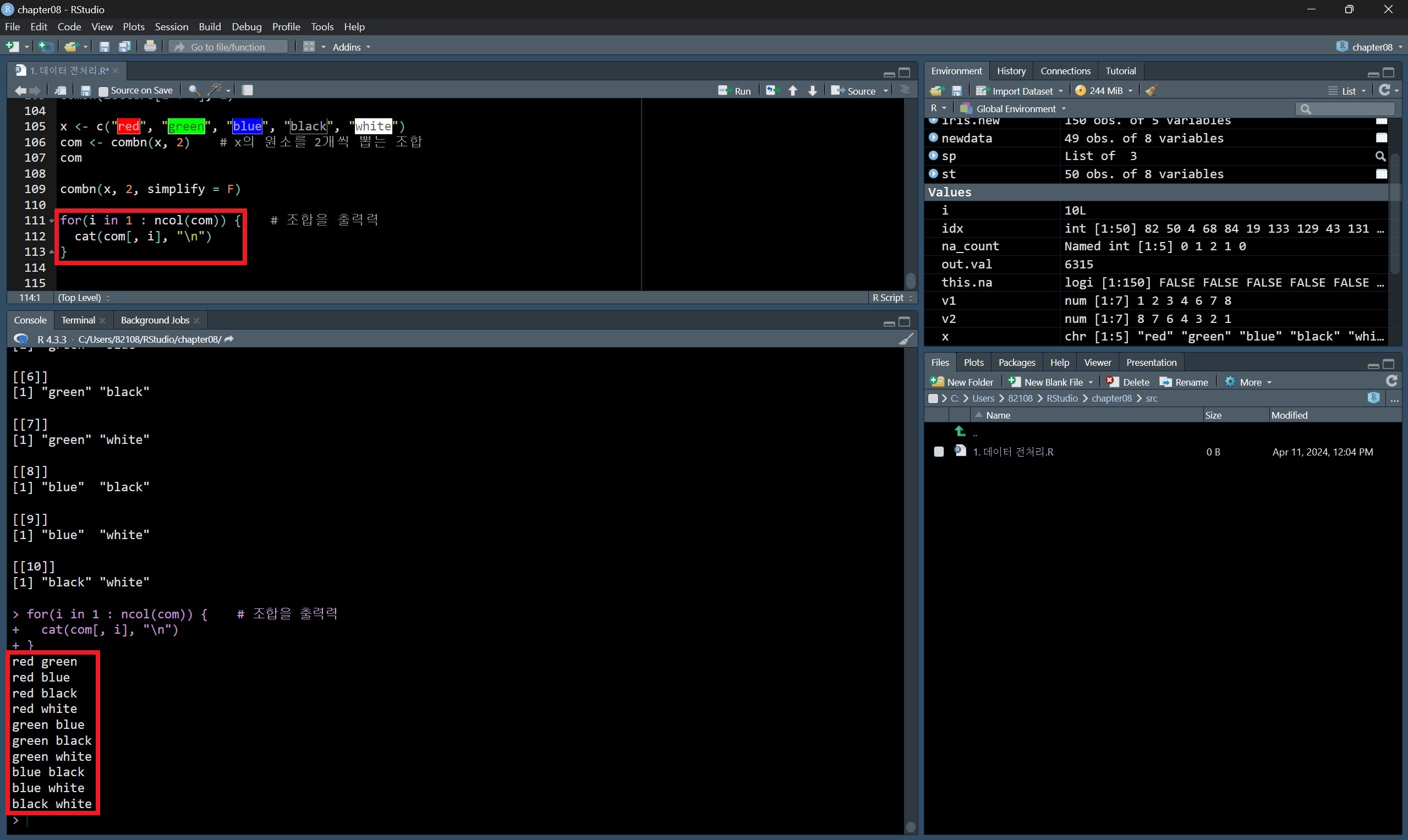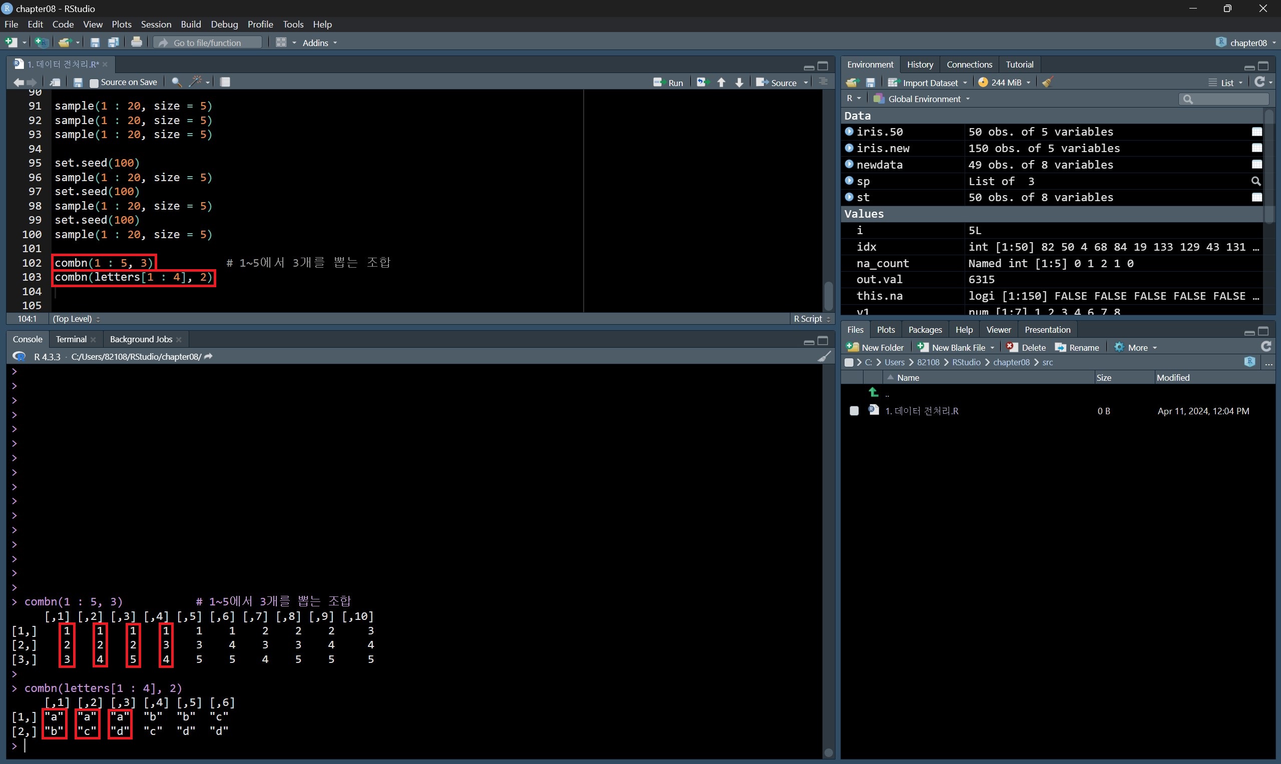 combn(데이터, 개수) 형식으로 작성한다.