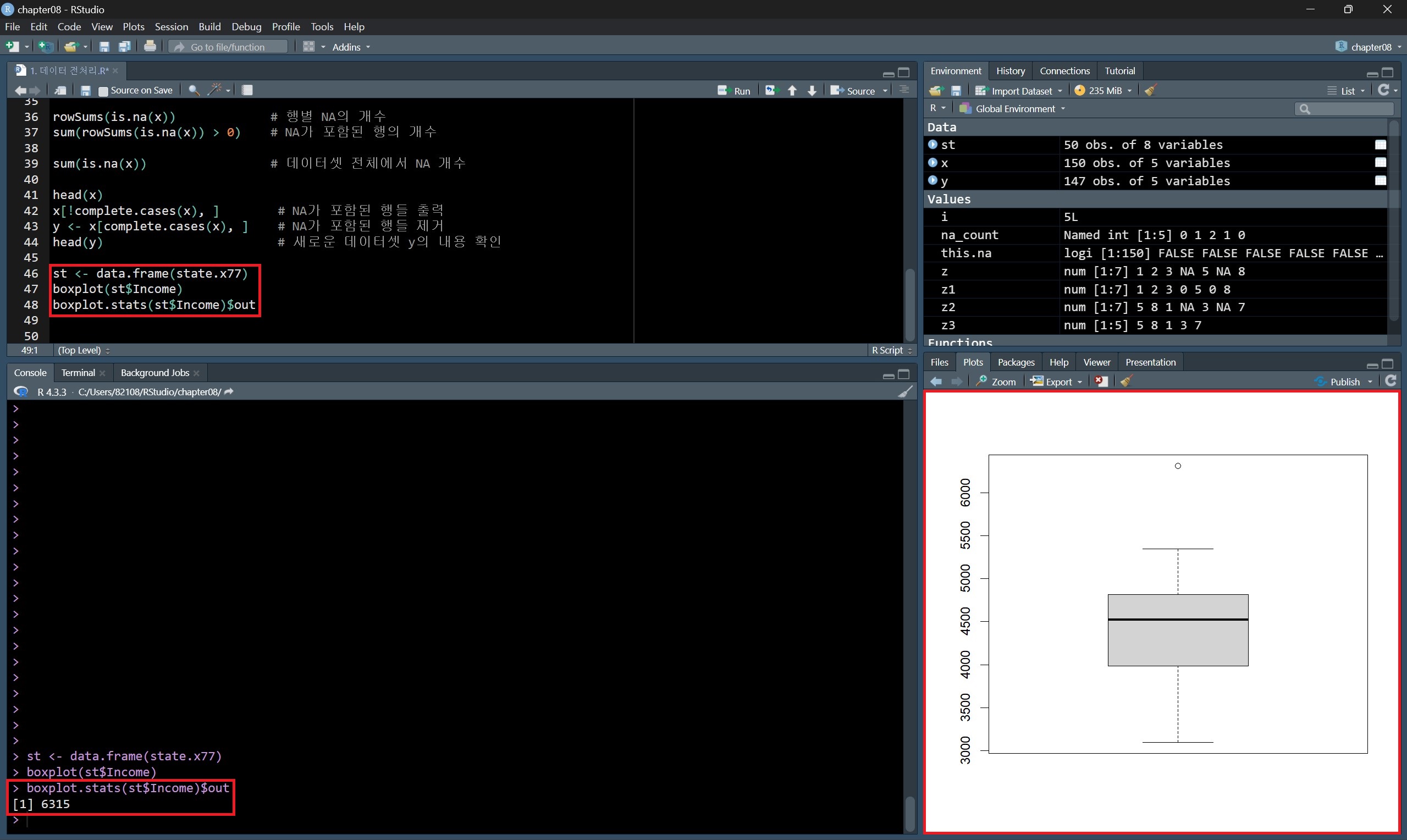 | [R 공부하기] 6. 단일변수 자료 탐색 - 우당탕탕 개발자 되기 프로젝트 (0) | 2024.04.23 |