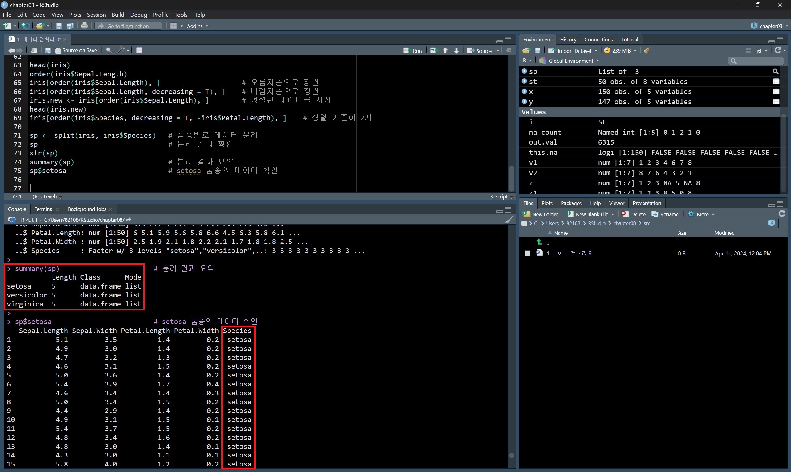 분리한 결과에 summary() 함수를 적용하면 분리 결과를 요약하여 확인할 수 있다.