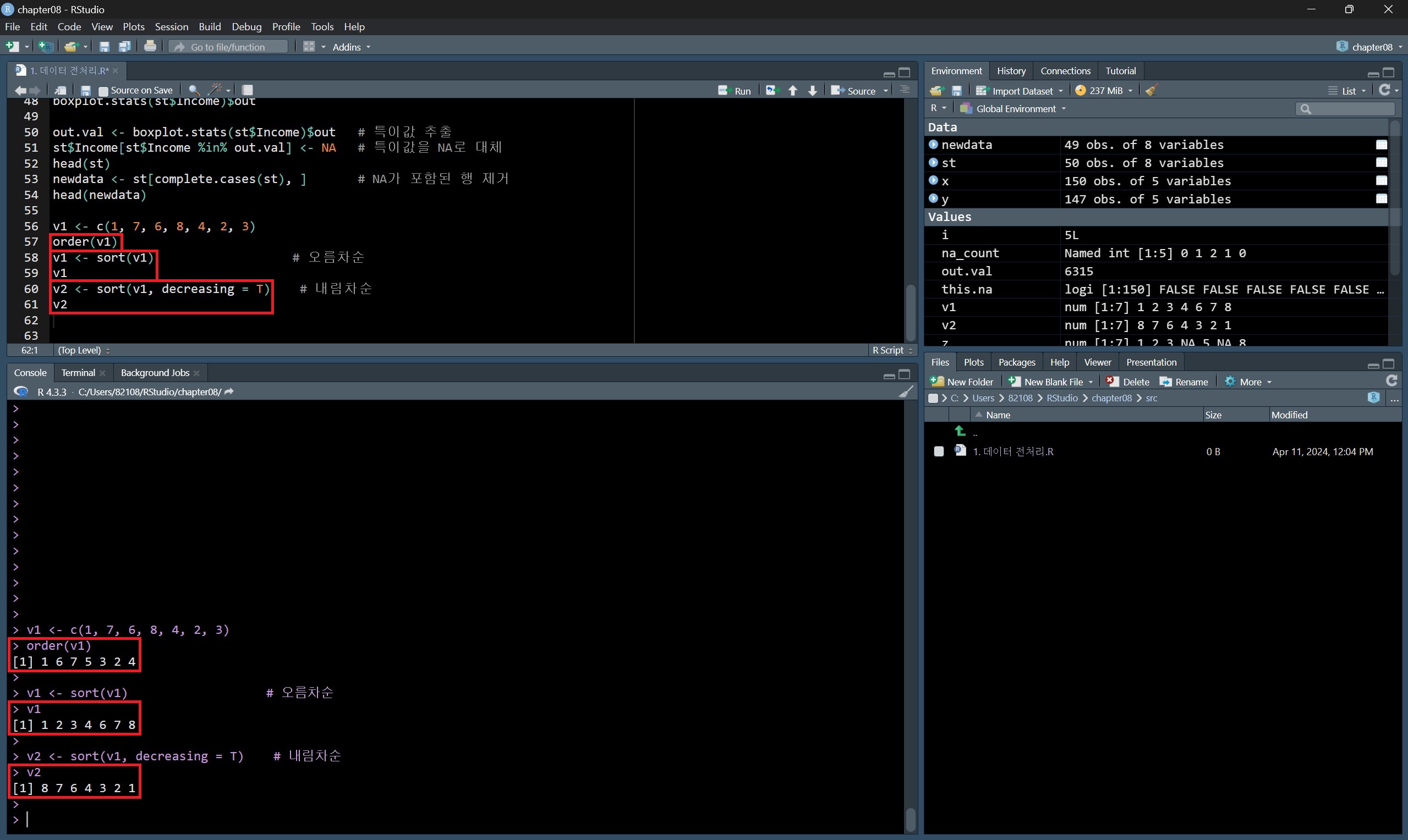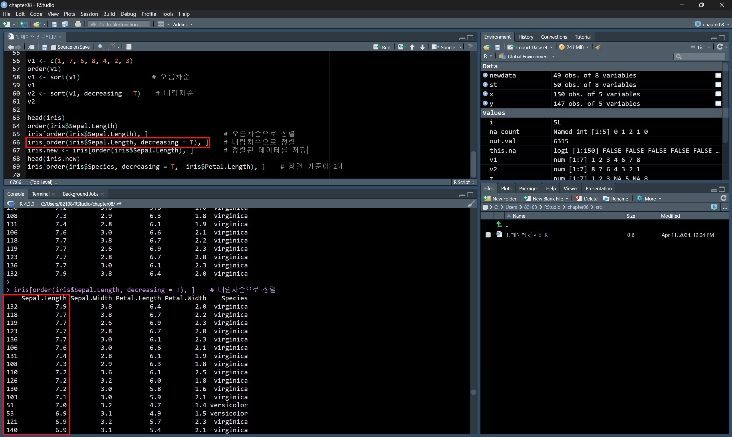 sort() 함수에서 decreasing 옵션을 T로 해주면 각 데이터를 내림차순 한 결과를 나타낸다.