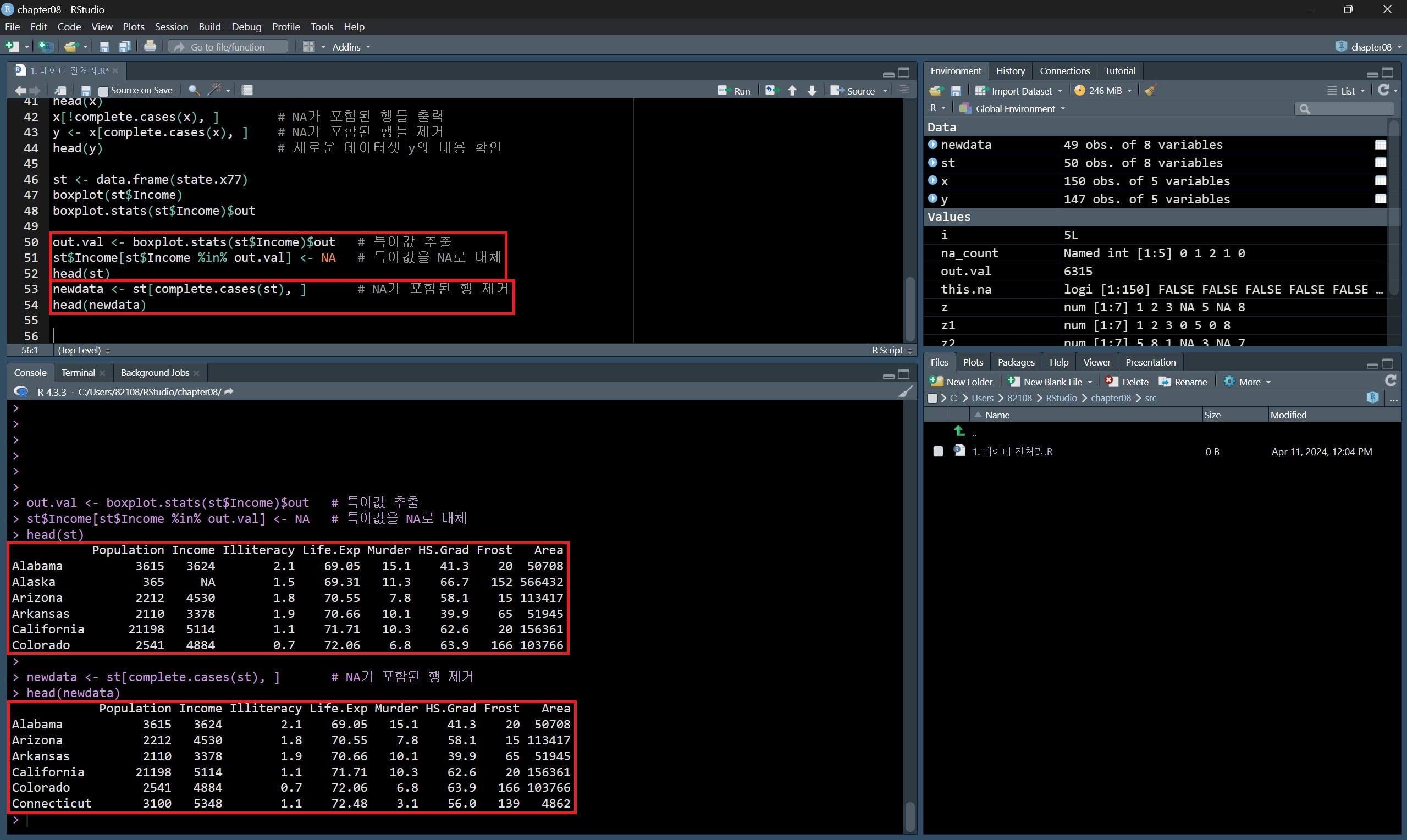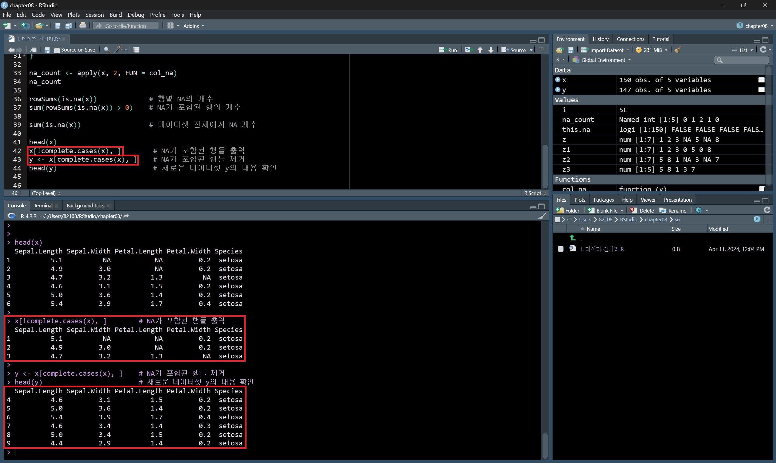 반면 complete.cases() 함수의 결과를 데이터프레임에 그대로 사용하면 결측값이 포함된 행들이 제거된다.
