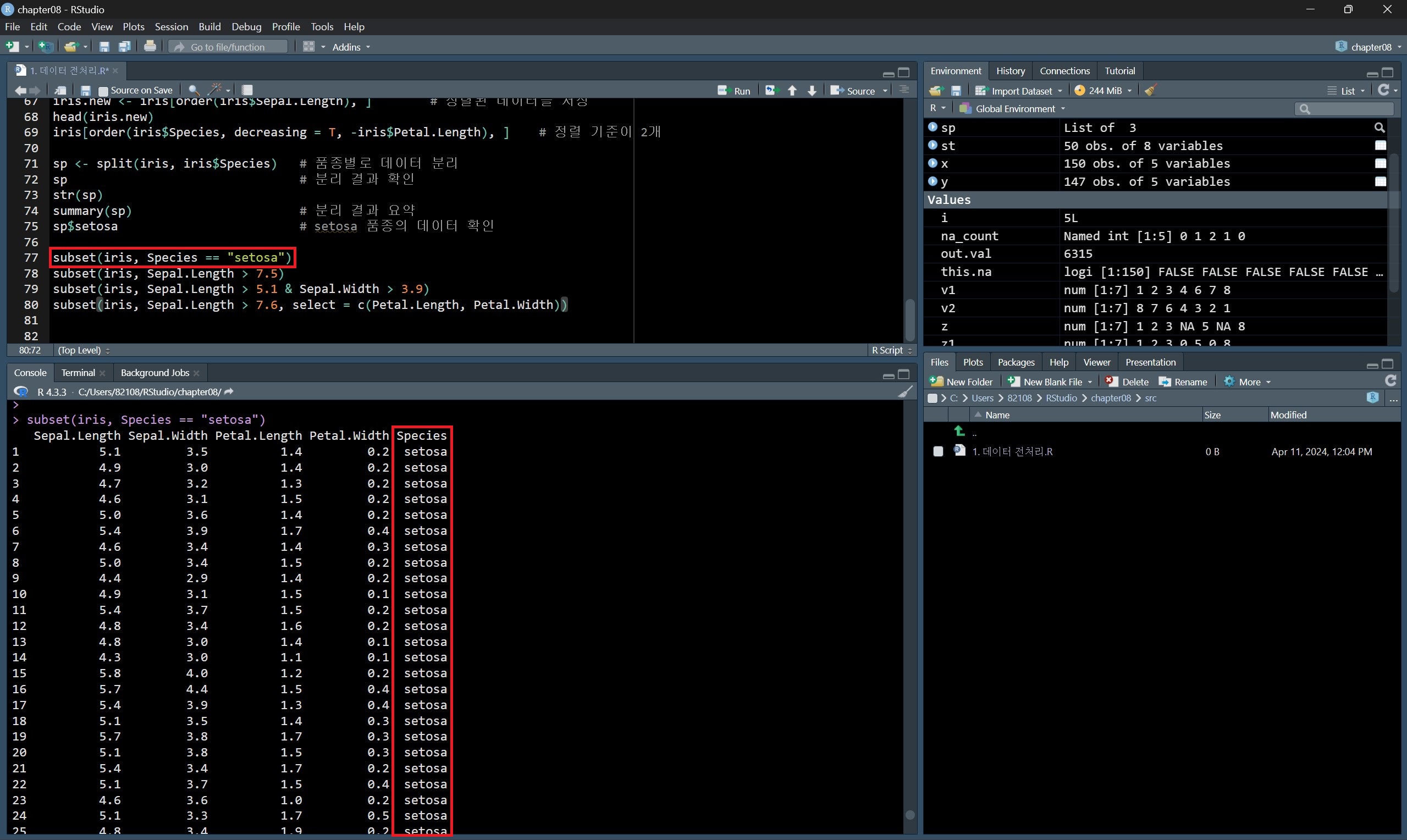 subset() 함수를 사용하면 데이터의 일부를 선택할 수 있다.