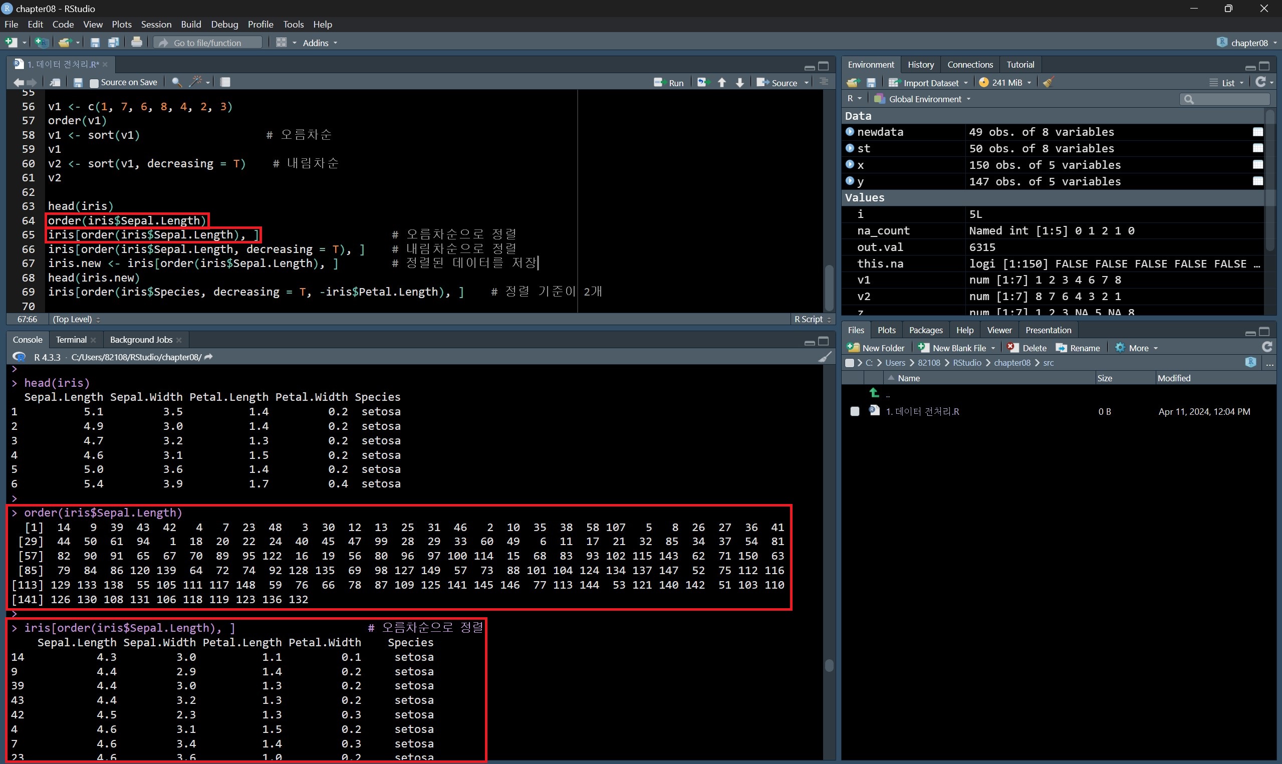내림차순으로 정렬한 인덱스 값을 매트릭스와 데이터프레임에 적용시키면 해당 매트릭스와 데이터프레임을 정렬할 수 있다.