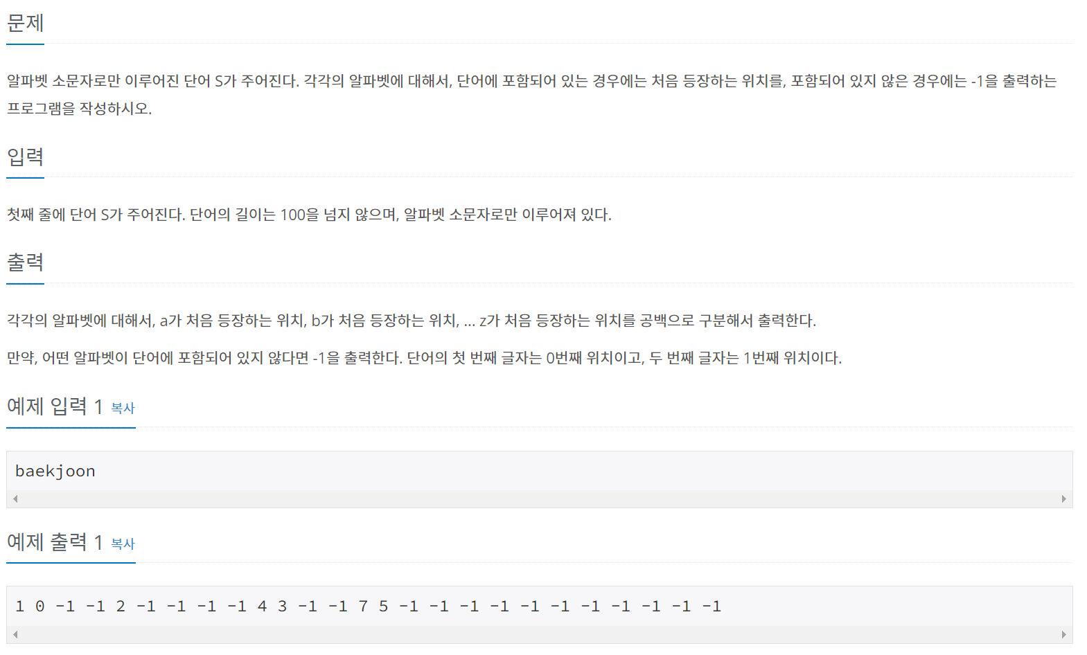 각각의 알파벳에 대해서, a가 처음 등장하는 위치, b가 처음 등장하는 위치, ... z가 처음 등장하는 위치를 공백으로 구분해서 출력한다. 만약, 어떤 알파벳이 단어에 포함되어 있지 않다면 -1을 출