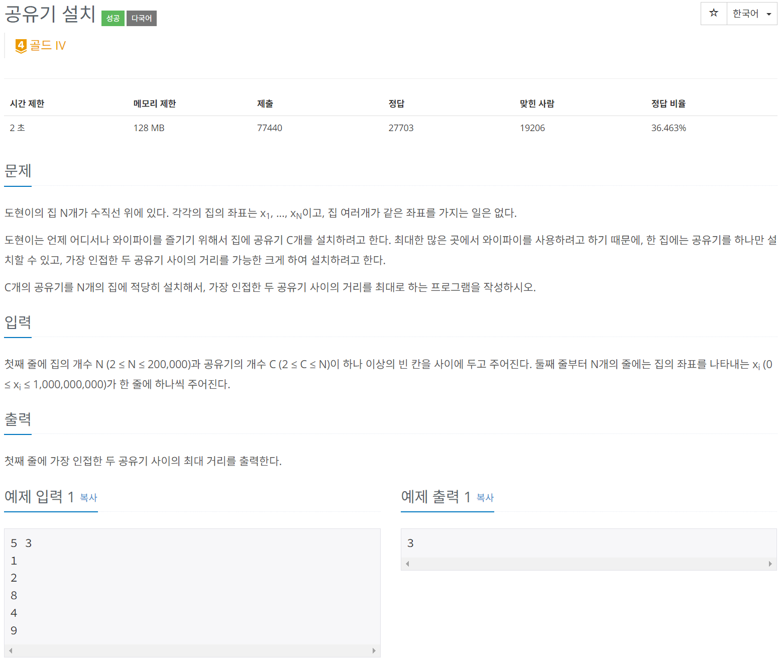 - 집의 개수와 공유기의 개수를 입력받는다. N, C = map(int, sys.stdin.readline().split())