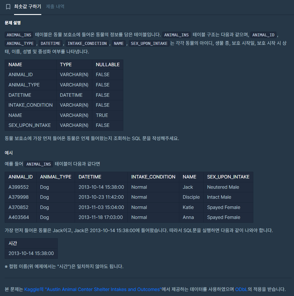 해당 문제는 가장 먼저 들어온 동물을 찾아 들어온 시간을 조회하는 문제이다.