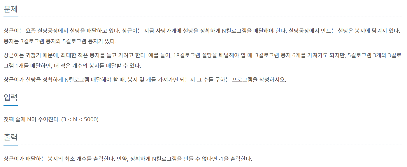 - 총 배달해야 할 설탕의 무게를 입력받는다. N = int(sys.stdin.readline())