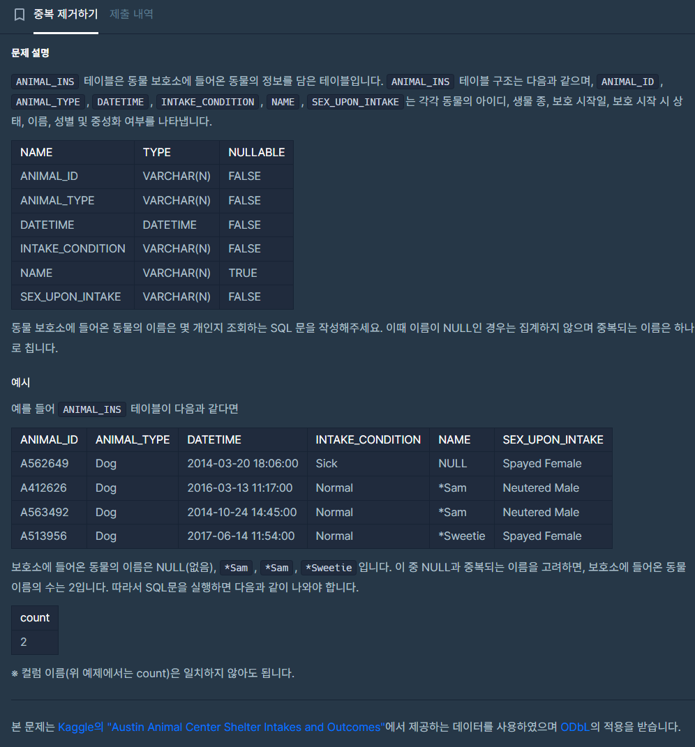 해당 문제는 동물 보호소에 들어온 동물의 이름은 몇 개인지 조회하는 문제이다.