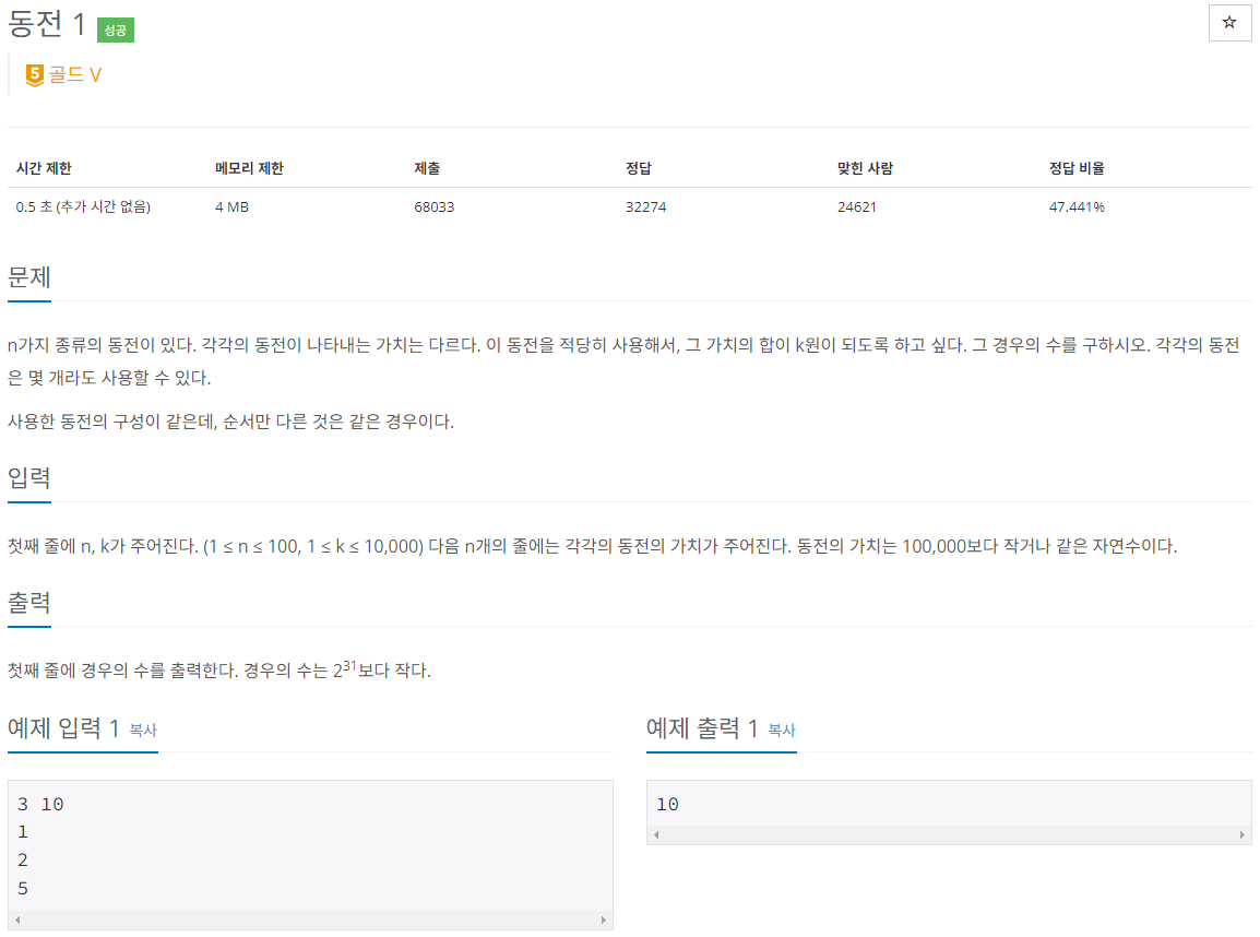 해당 문제는 동전을 여러 개 사용하여 가치의 합을 맞출 수 있는 모든 경우의 수를 구하는 문제이다.