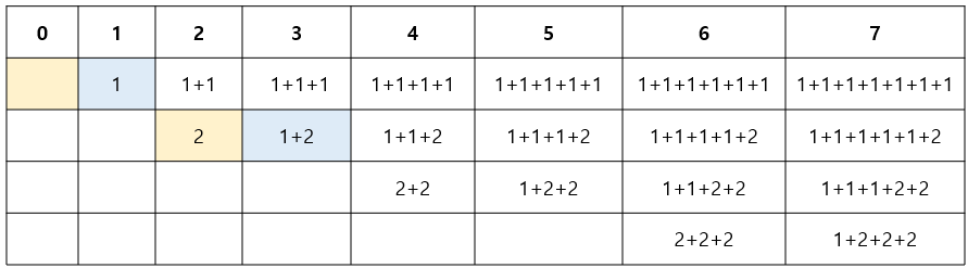 이렇게 계속 동전의 가치를 올리며 각 동전으로만 만들 수 있는 경우를 이전 경우에 추가한다.