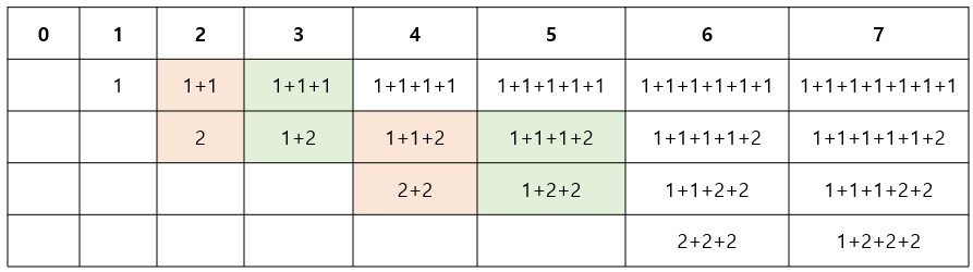 여기서 2는 0의 경우에 2를 추가한 경우이고, 3은 1의 경우에 2를 추가한 경우이다.