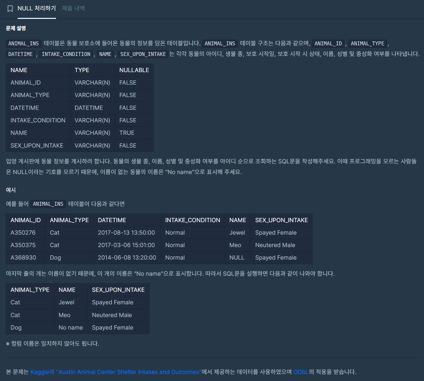 해당 문제에서 중요한 점은 이름이 없는 동물의 이름은 NULL 기호 대신 "No name"으로 표시해줘야 한다는 것이다.