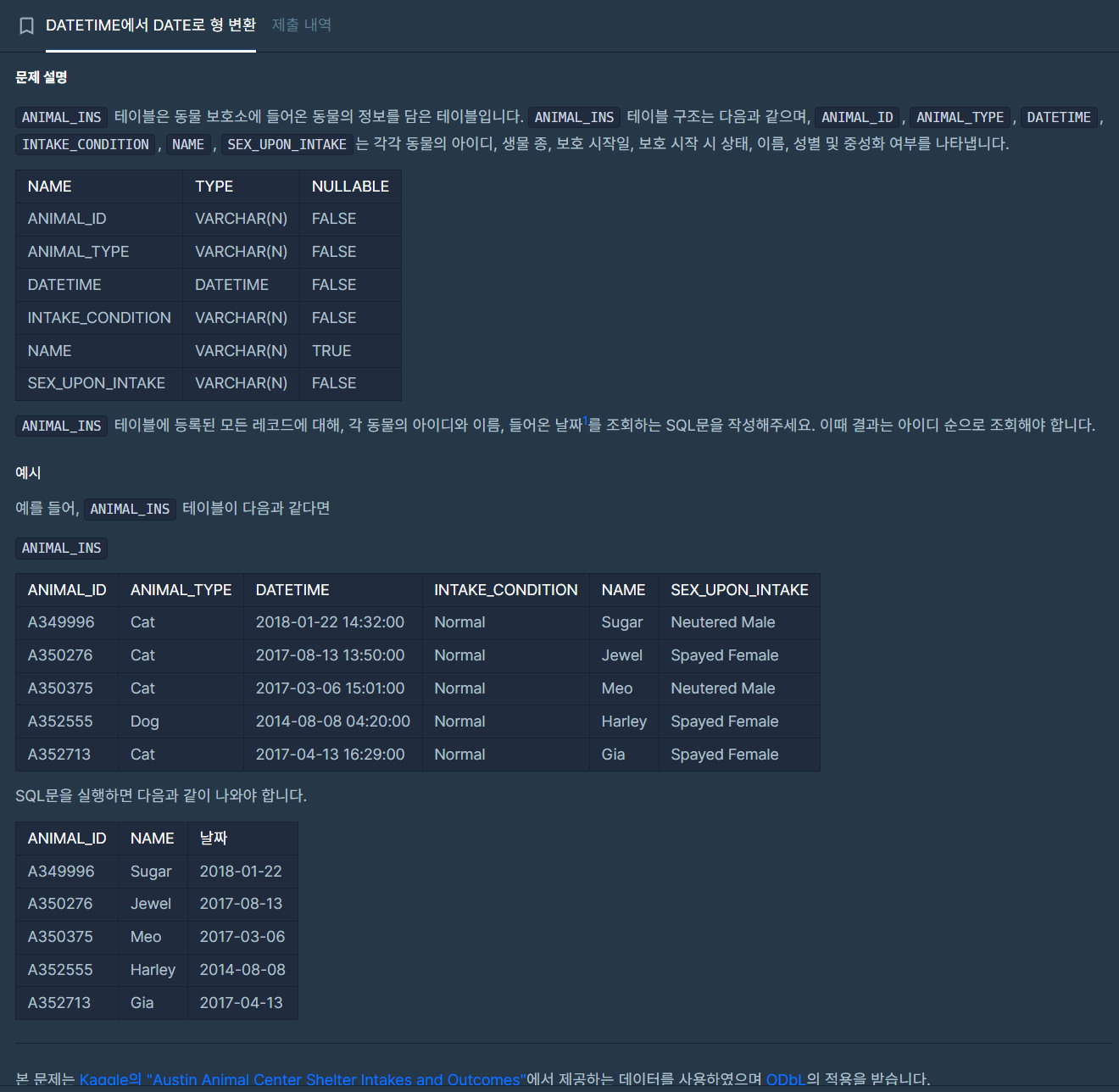 해당 문제에서 중요한 점은 데이터를 조회하는 테이블에서 날짜 컬럼의 들어온 날짜 형식과 실행 후 결과에서의 날짜 형식이 다르다는 것이다.