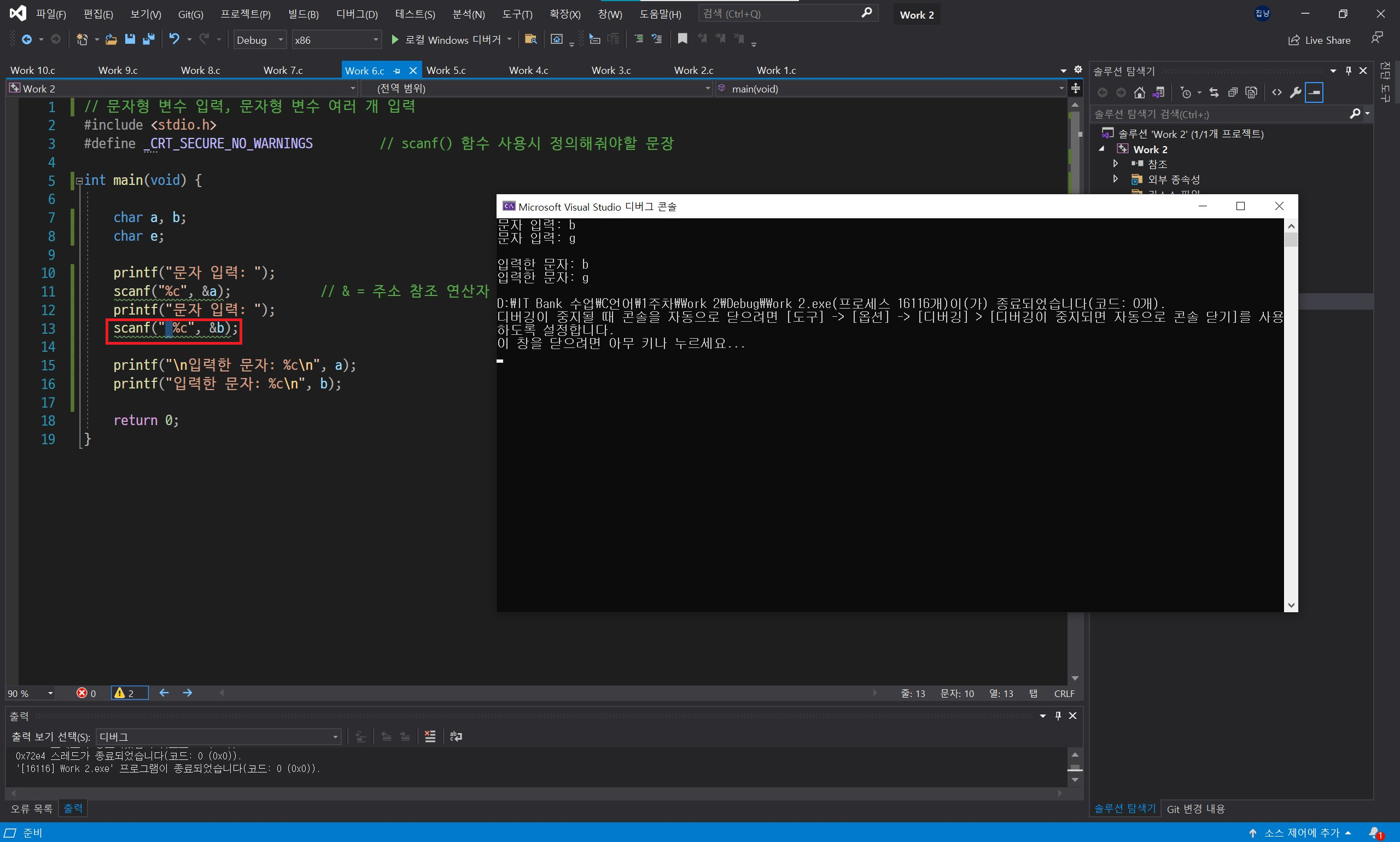 이러한 문제를 해결하는 방법에는 첫 번째 문자를 입력받는 scanf() 함수 다음부터는 형식 지정자 앞에 한 칸의 공백을 두어 Enter의 입력을 받도록 만들어주는 방법이 있습니다.