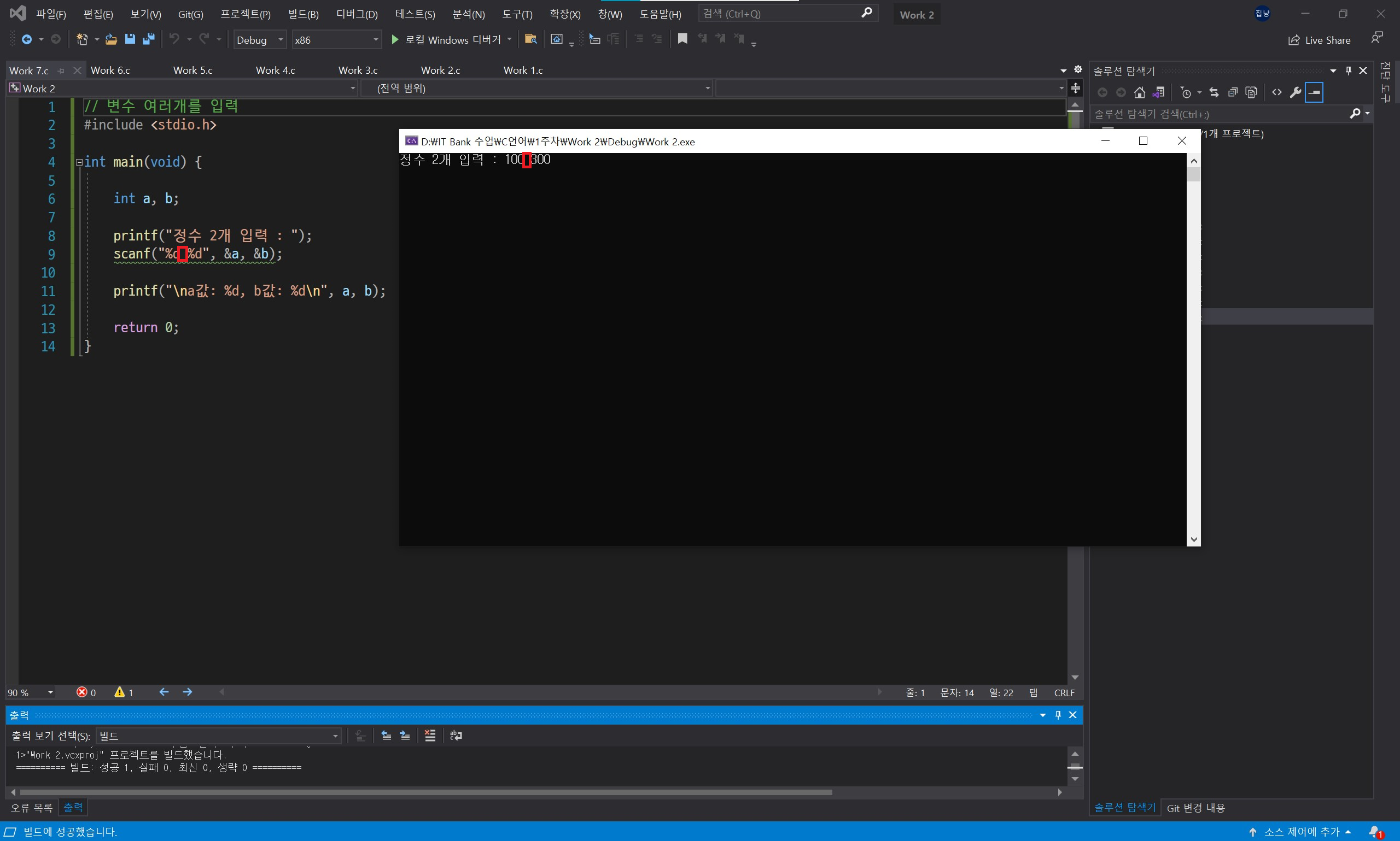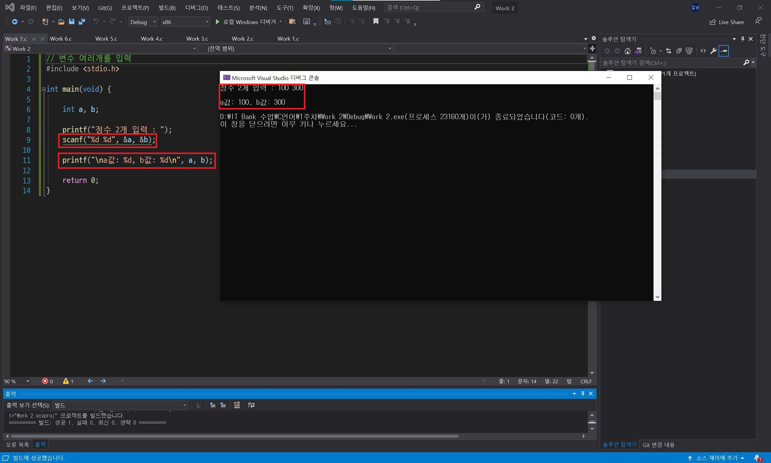 scanf() 함수에서 값을 여러 개 동시에 입력받을 때는 각 형식 지정자 사이에 공백을 두어 분리하고 입력할 때도 각 값을 스페이스 바로 분리하여 정확하게 입력해야 값이 받아지는 것을 알아두세요!
