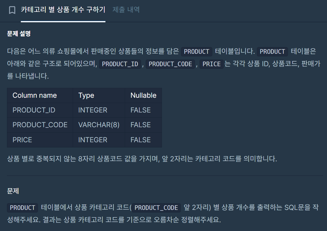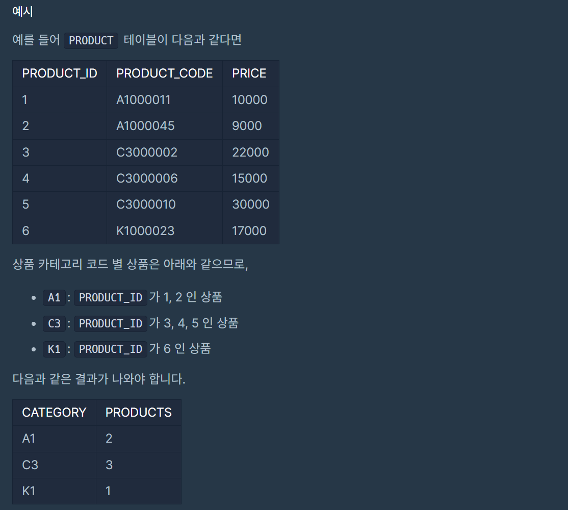 해당 문제는 상품 카테고리 코드 별 상품 개수를 조회하는 문제이다.