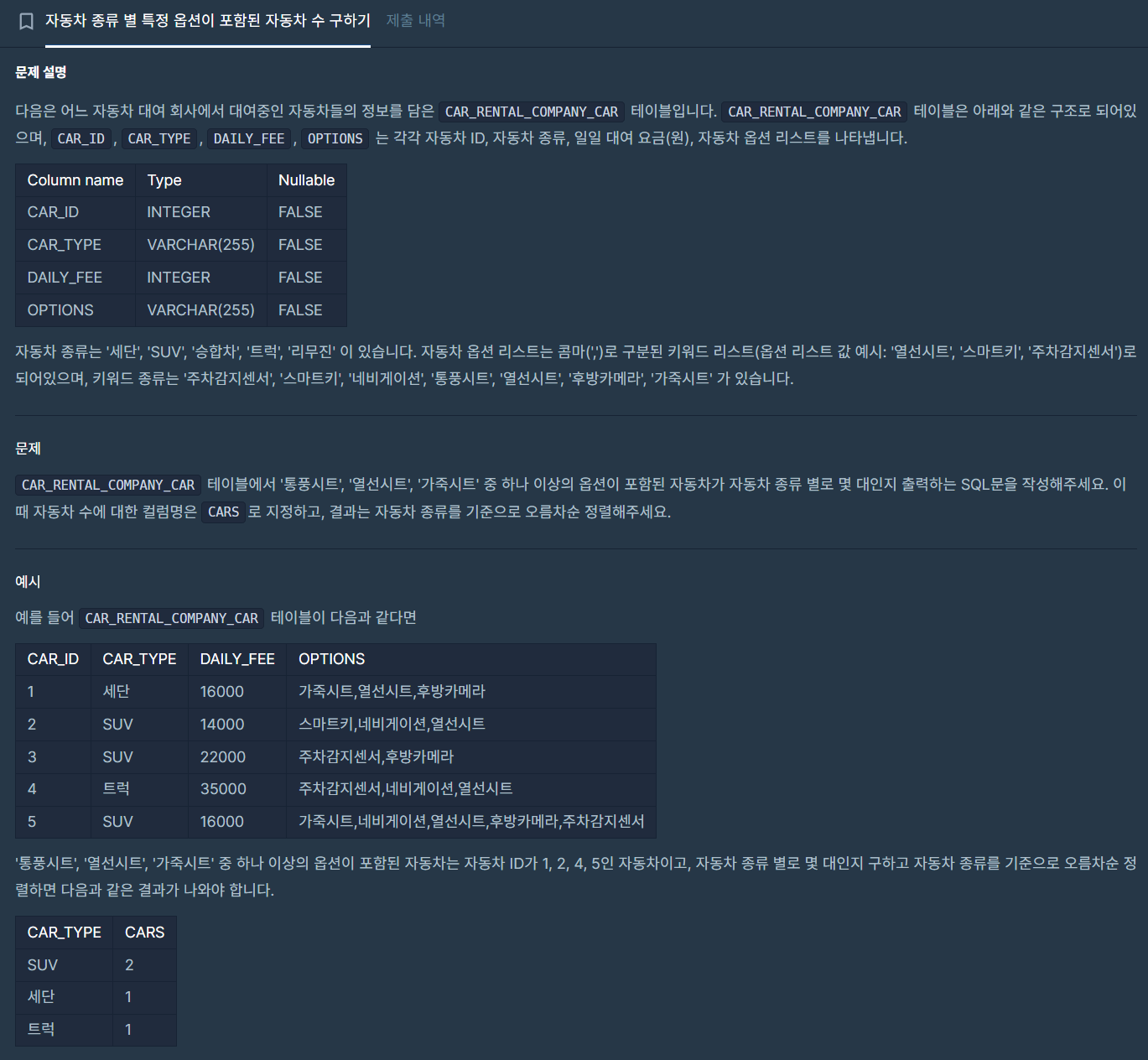 나열된 문자열에서 각 '통풍시트', '열선시트', '가죽시트'가 포함되어 있는지 확인할 때는 LIKE 문을 활용하면 된다.