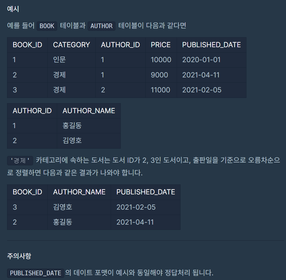 해당 문제를 보면 도서 정보 테이블에 있는 저자 ID 컬럼과 저자 정보 테이블에 있는 저자 ID 컬럼이 동일하므로 해당 컬럼을 기준으로 JOIN 해주면 된다.