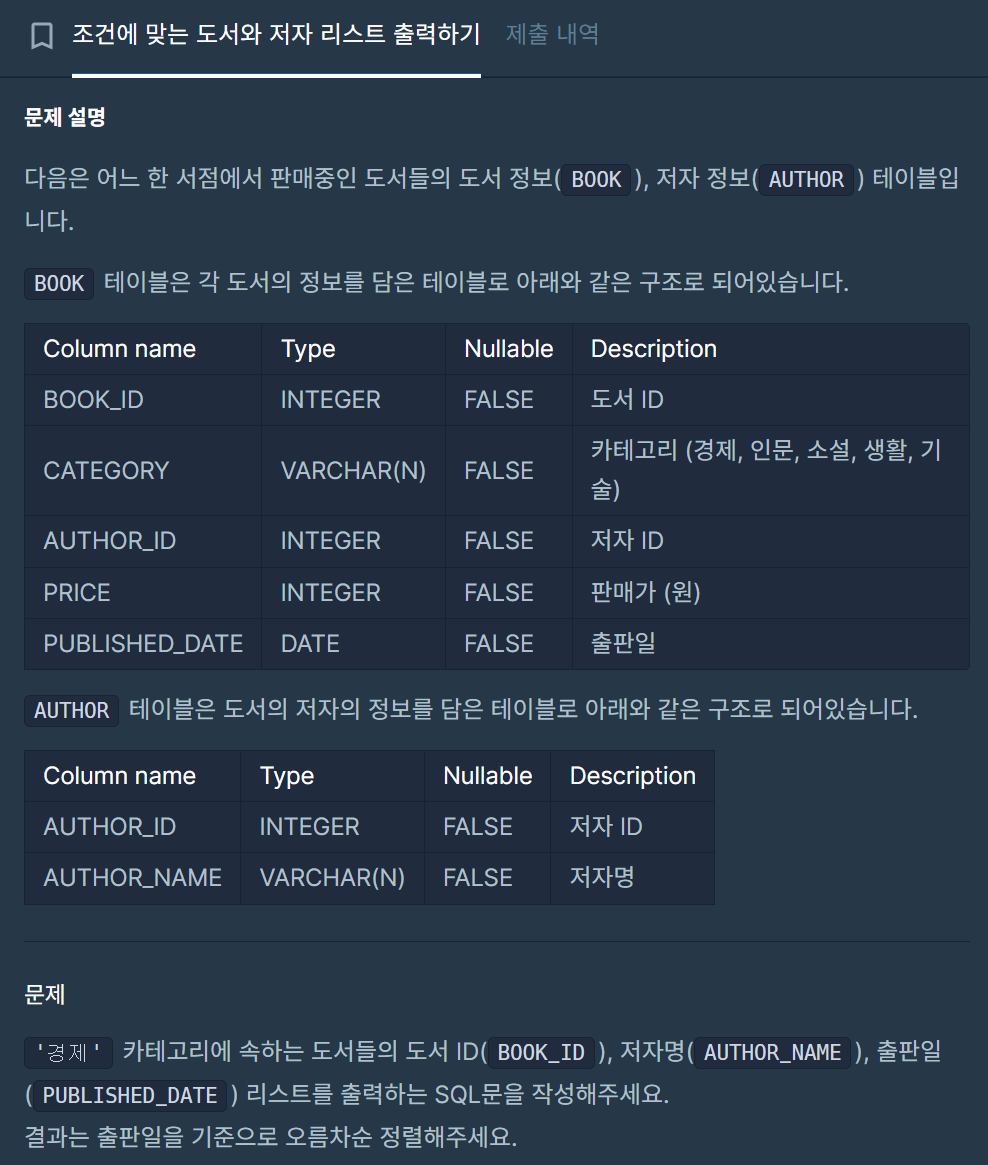 해당 문제는 '경제' 카테고리에 속하는 도서들의 도서 ID, 저자명, 출판일을 조회하는 문제이다.