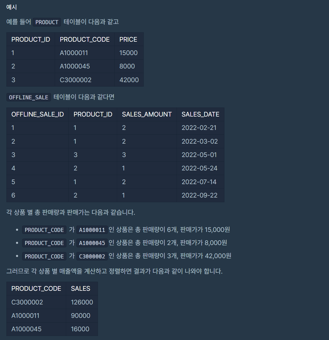 문제에서는 상품 정보를 담은 PRODUCT 테이블과 오프라인 상품 판매 정보를 담은 OFFLINE_SALE 테이블이 주어진다.
