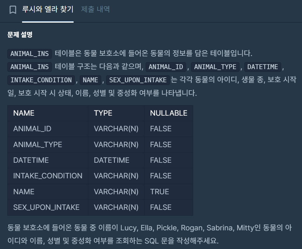 해당 문제는 동물 보호소에 들어온 동물 중 이름이 Lucy, Ella, Pickle, Rogan, Sabrina, Mitty인 동물의 아이디와 이름, 성별 및 중성화 여부를 조회하는 문제이다.