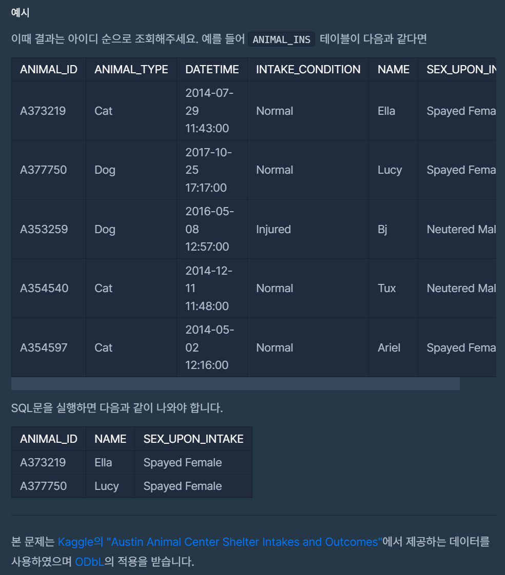 - 최종 결과는 아이디 순으로 조회한다. ORDER BY ANIMAL_ID