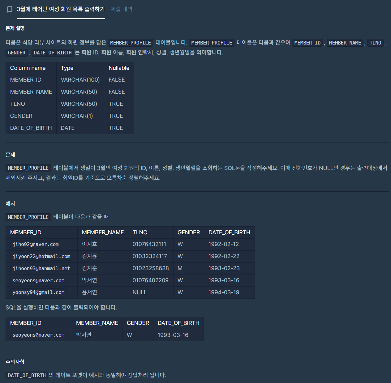 해당 문제는 생일이 3월인 여성 회원의 ID, 이름, 성별, 생년월일을 조회하는 문제이다.