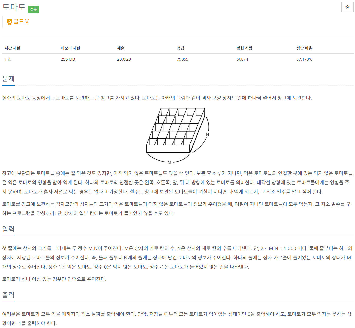 이렇게 익지 않은 토마토들이 익어가며 모든 토마토가 익는 최소 날짜를 구하면 된다.이는 박스 안 익은 토마토의 범위를 4방향으로 넓혀가며 모든 토마토가 익을 수 있는지 익을 수 있다면 최소 날짜를 구하는 문제이므로 너비 우선 탐색(BFS)으로 쉽게 구할 수 있다.해당 경로를 찾아나가는 것이 아니라 범위를 점점 넓혀가며 가능한 범위를 찾는 문제이기 때문에 BFS 알고리즘으로 쉽게 구할 수 있다.
