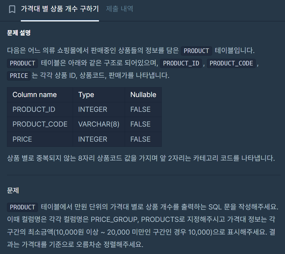 해당 문제는 만원 단위의 가격대 별로 상품 개수를 조회하는 문제이다.