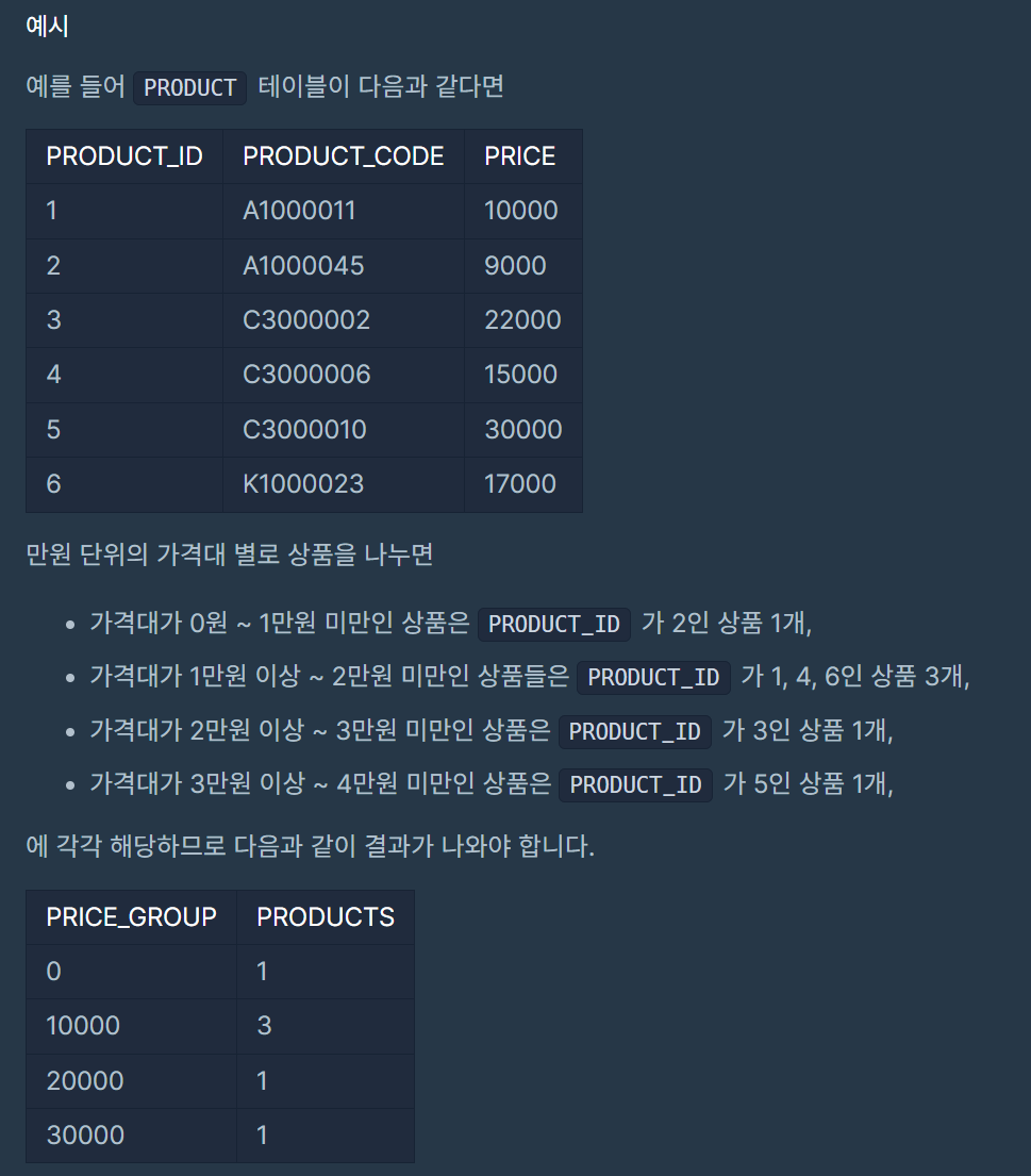 - 가격대 별로 상품 개수를 조회해야 하므로 가격대를 기준으로 그룹을 만들어준다. GROUP BY PRICE_GROUP