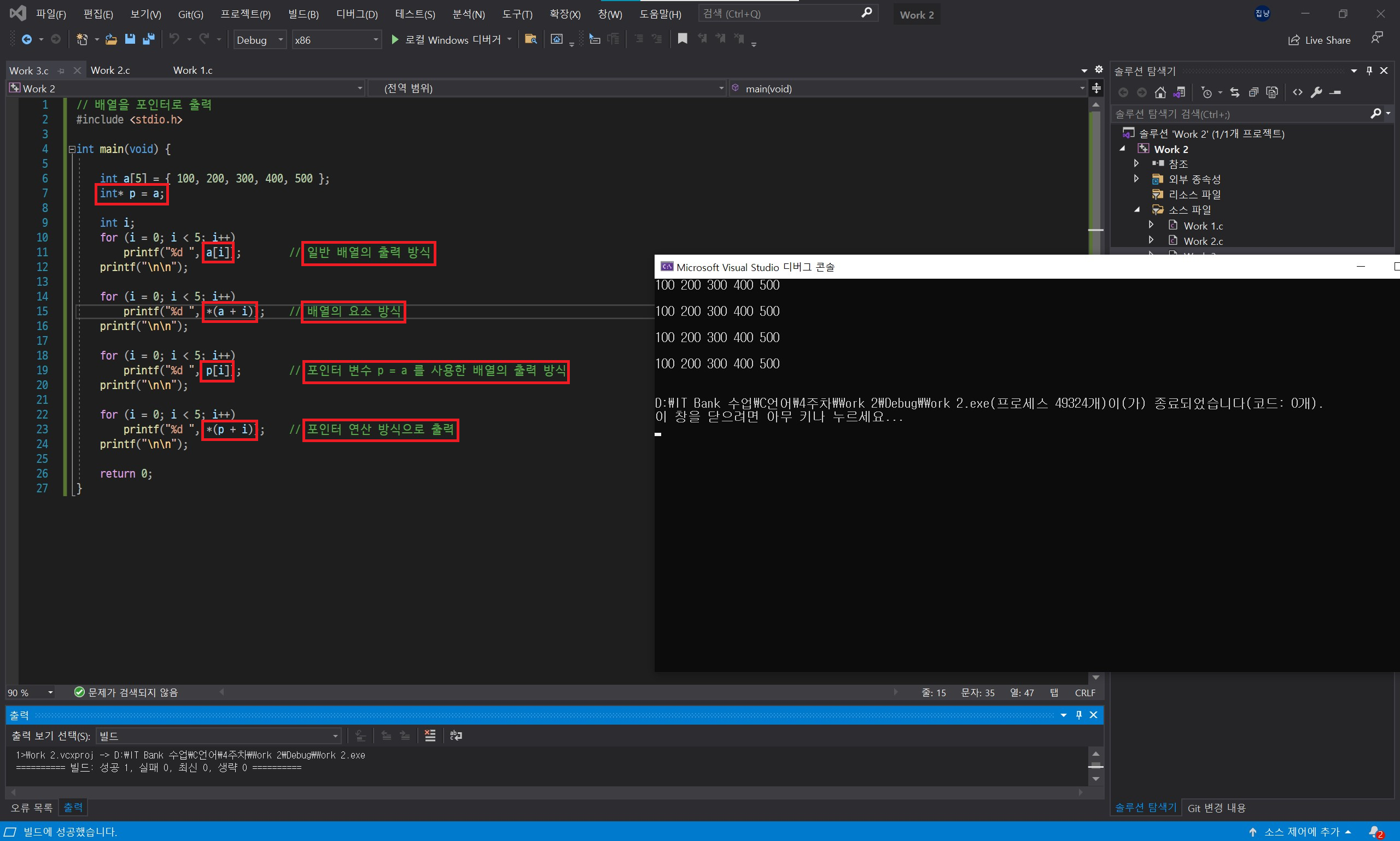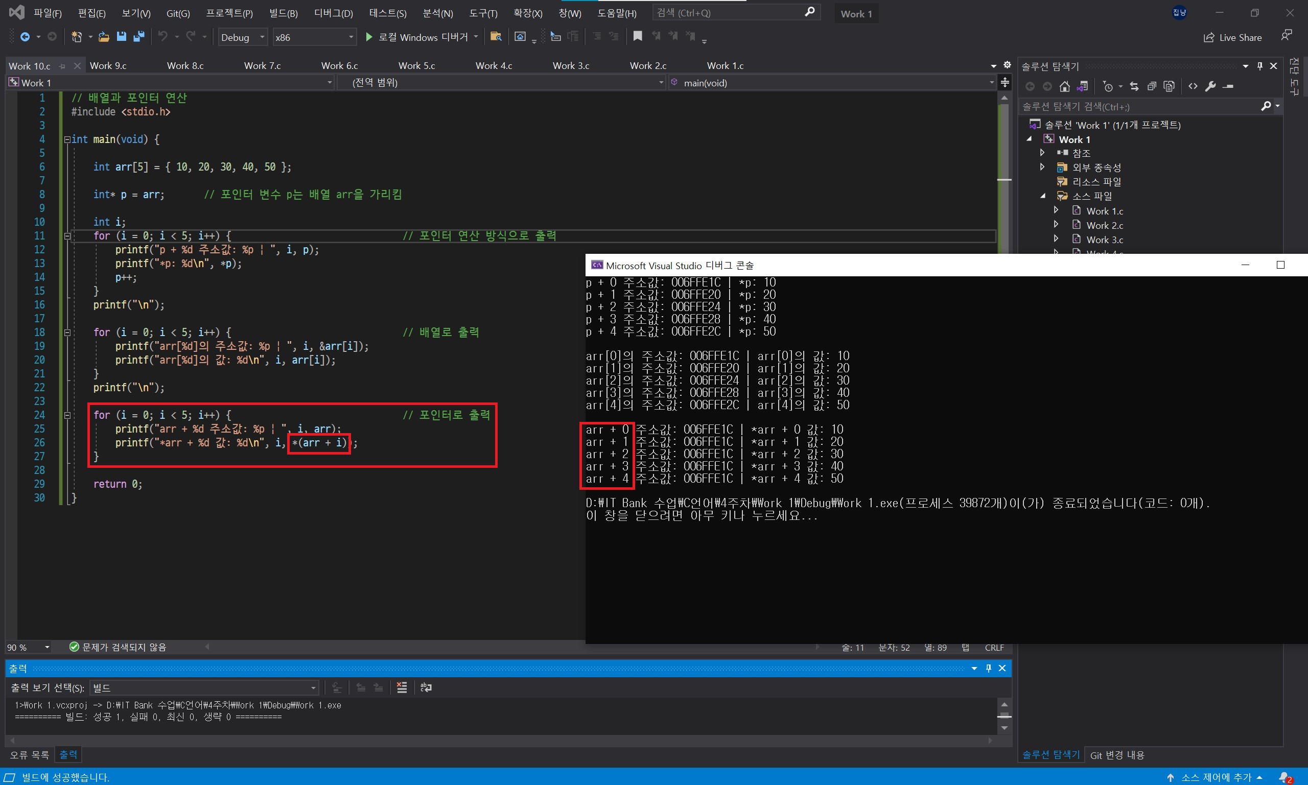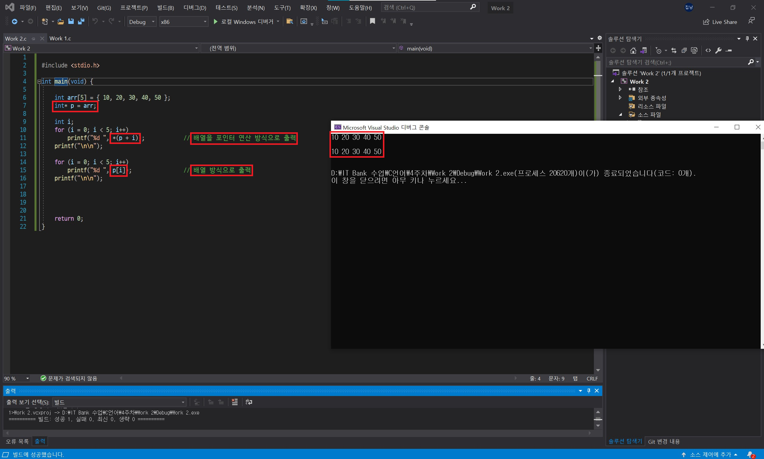 두 출력 방식의 결과는 동일합니다. 배열을 포인터를 사용하여 출력하는 방법은 역참조 연산자를 활용하여 배열 연산의 실제 값을 출력하는 방식으로 나타내었습니다. 배열 이름을 그냥 사용하면 배열의 시작 주소를 의미한다는 점을 활용하였습니다.