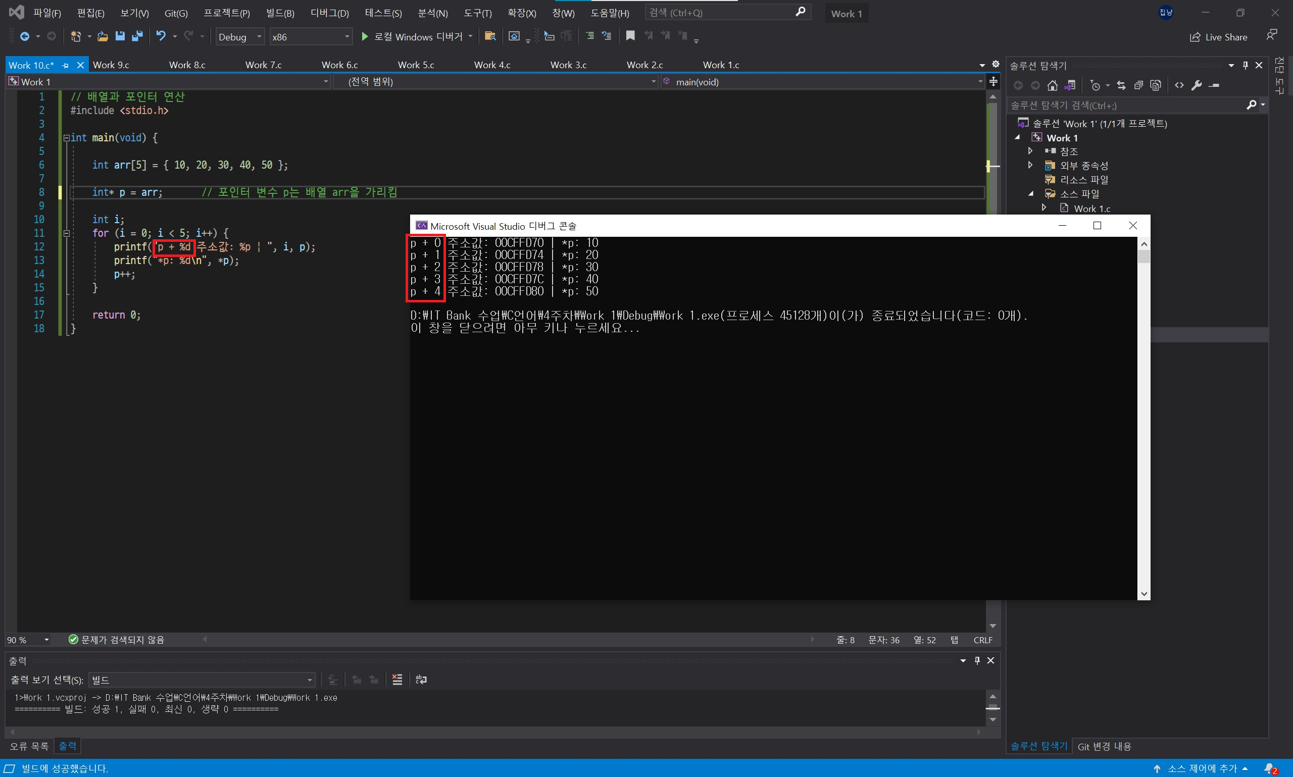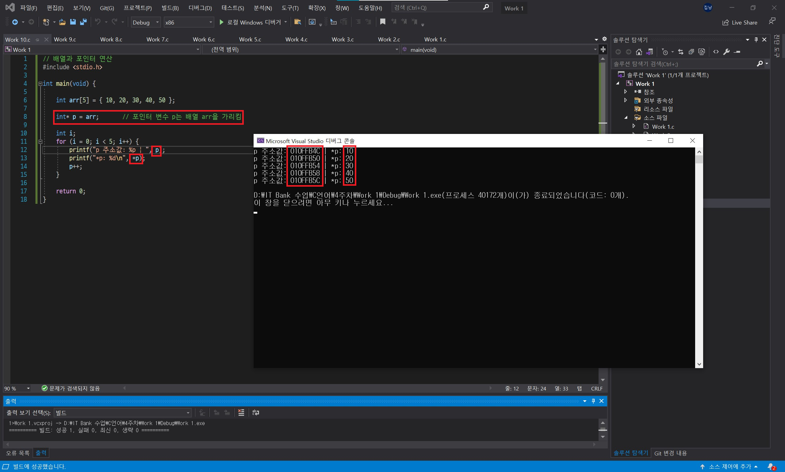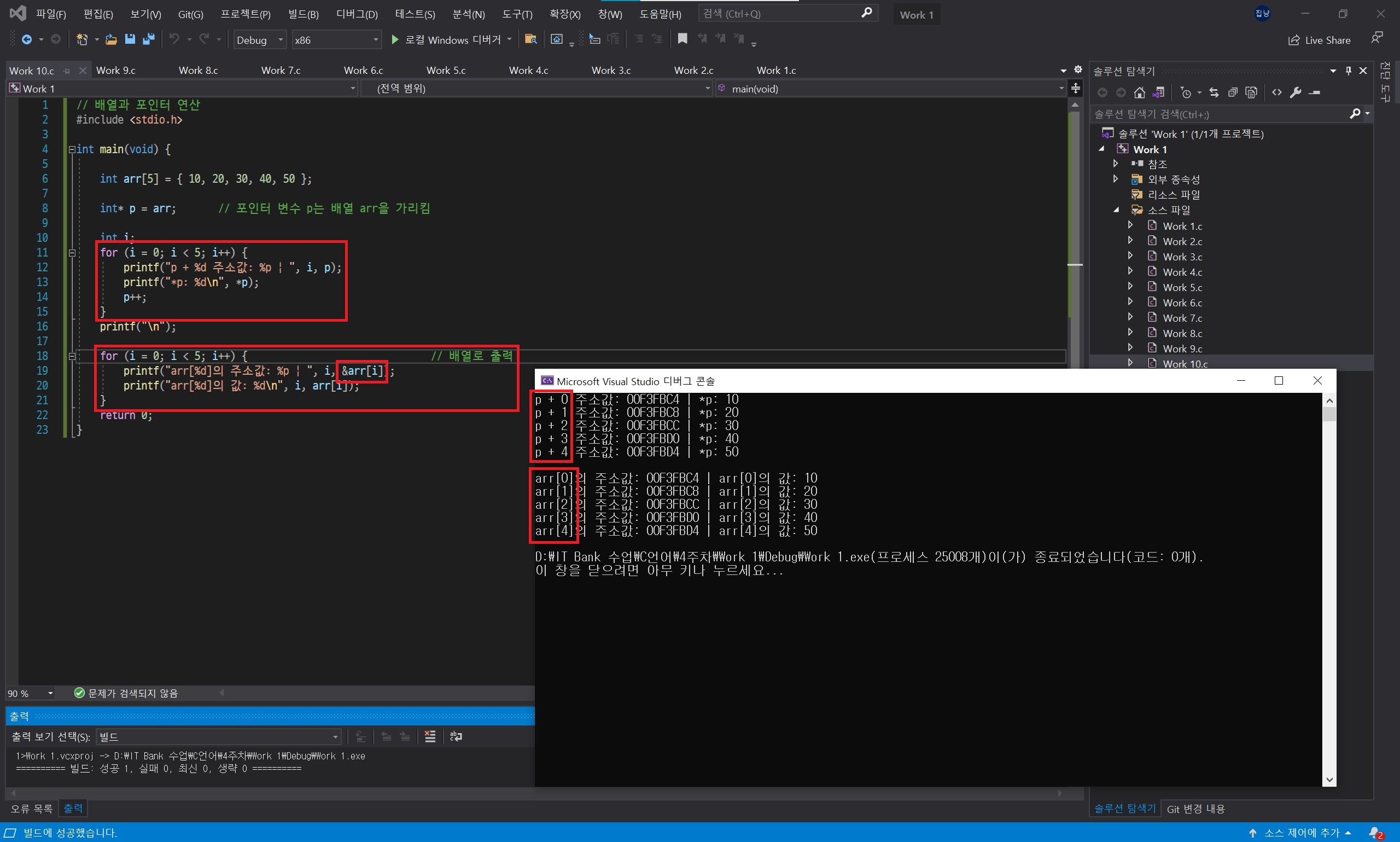 두 출력 방식의 결과는 동일합니다. 배열을 포인터를 사용하여 출력하는 방법은 역참조 연산자를 활용하여 배열 연산의 실제 값을 출력하는 방식으로 나타내었습니다. 배열 이름을 그냥 사용하면 배열의 시작 주소를 의미한다는 점을 활용하였습니다.