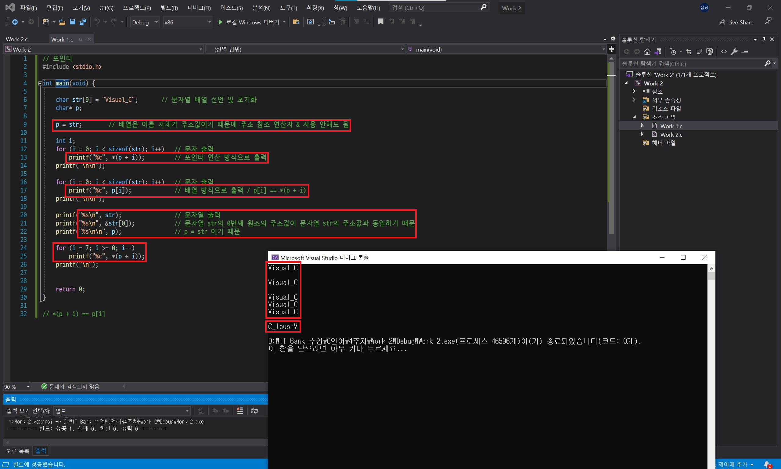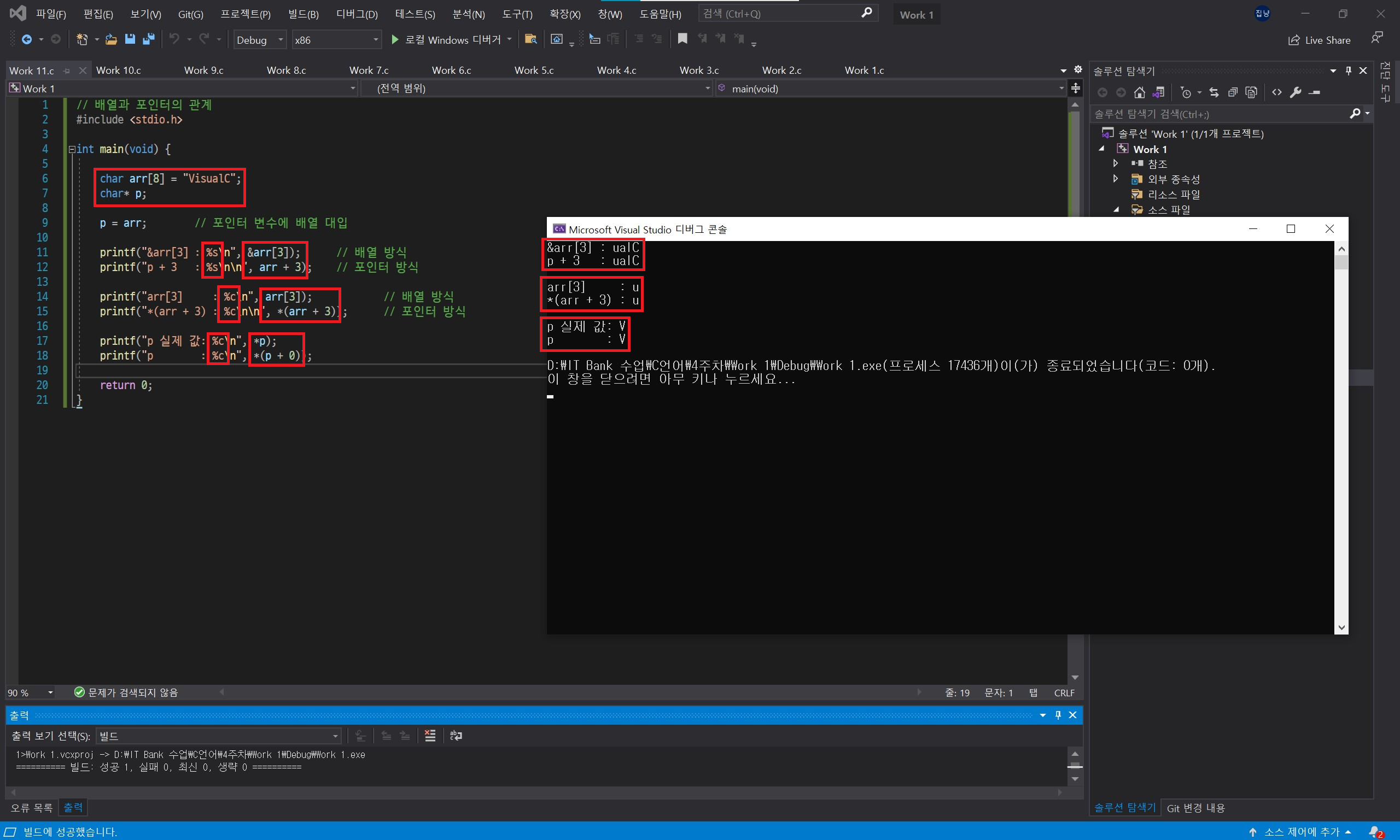 포인터 방식과 배열 방식으로의 출력을 계속해서 반복 학습하고 포인터 연산도 반복 학습해 보시길 바랍니다.