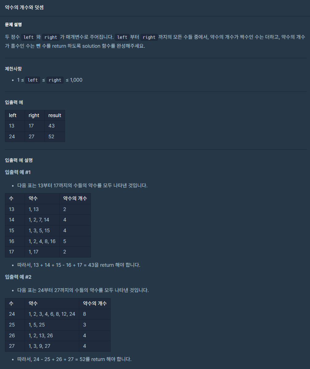 - 입력받은 매개변수 left와 right 사이의 수들을 모두 고려해야 하므로 반복문을 사용한다. for i in range(left, right + 1)