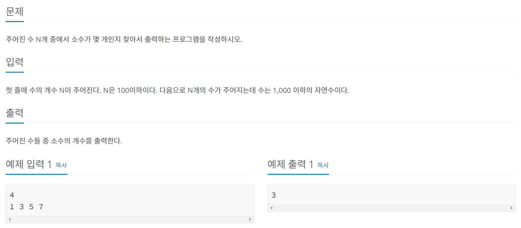 - 소수의 개수를 저장해 줄 변수를 생성하고 초기화해 준다. count = 0