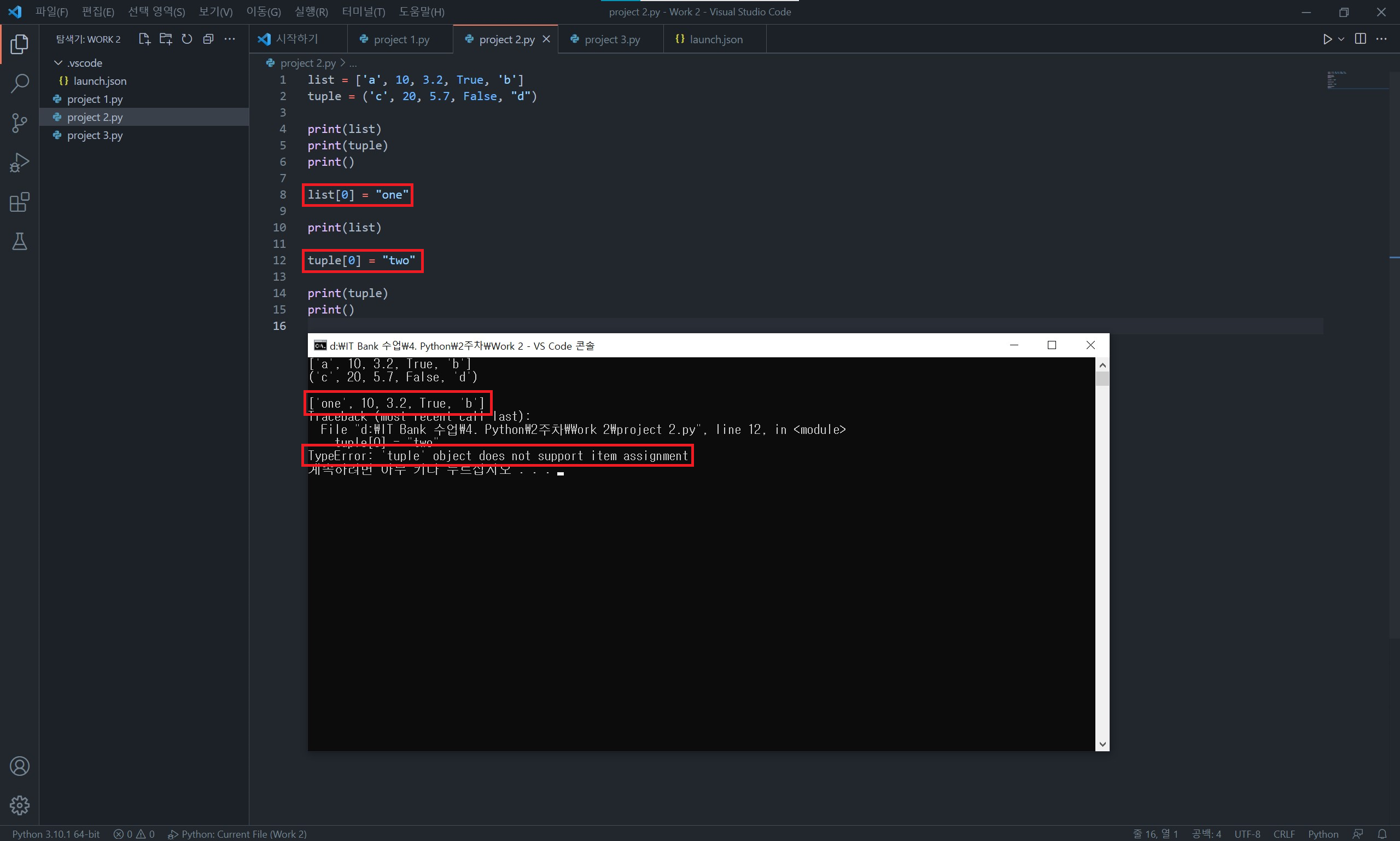 리스트로 묶어준 자료형은 각각의 자료를 인덱싱하여 변경할 수 있지만, 튜플로 묶어준 자료형은 각각의 자료를 변경할 수 없습니다.