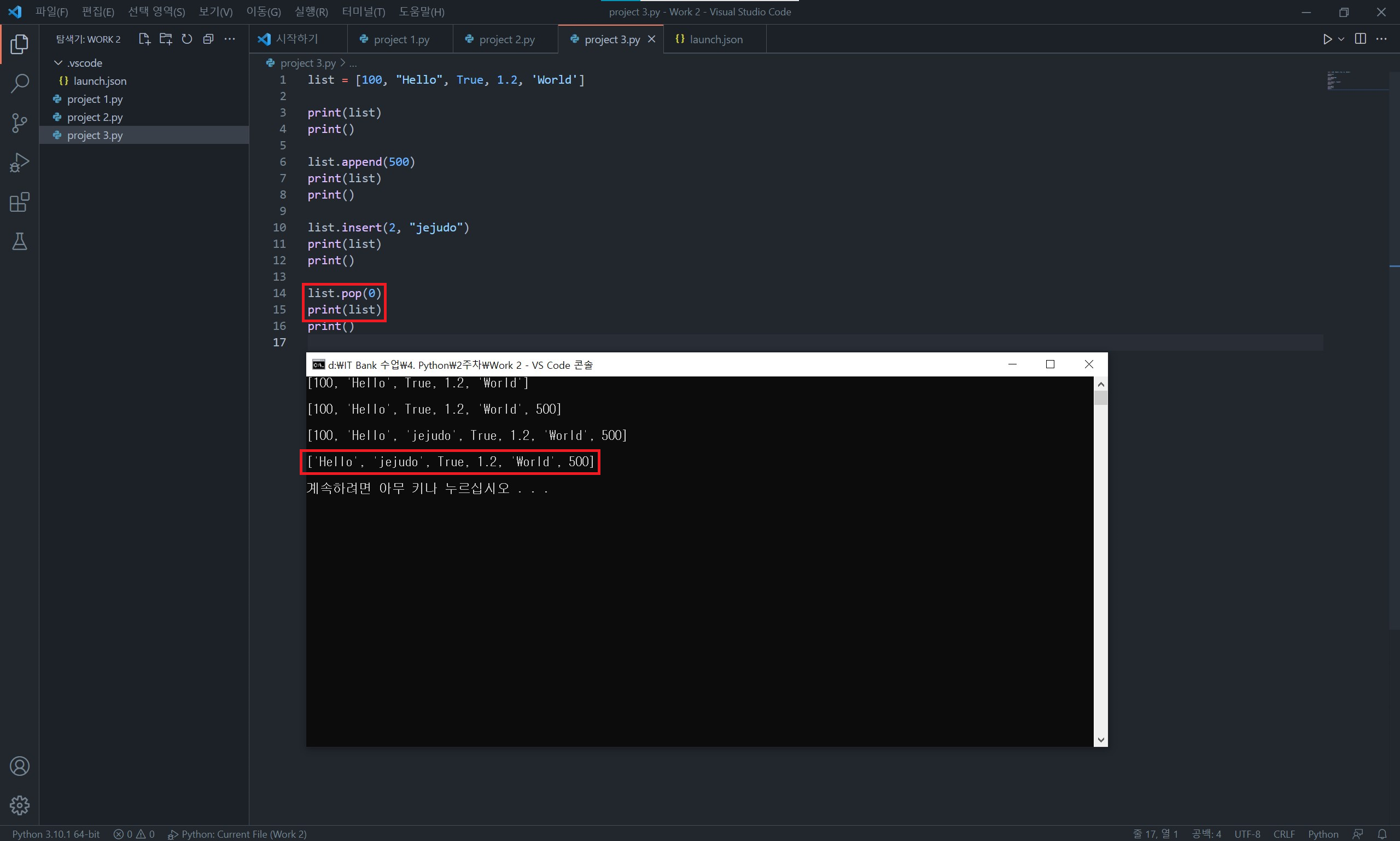 리스트명.pop(인덱스 값) 형식으로 작성해 주면 리스트 안에서 해당 인덱스의 자료를 삭제합니다.