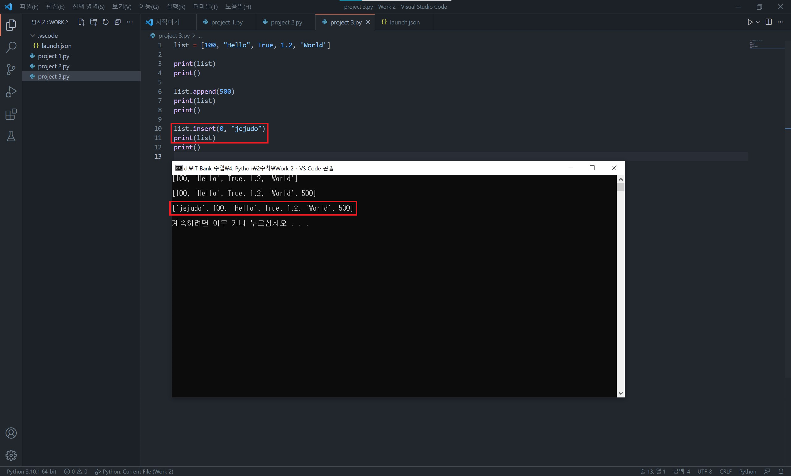 리스트명.insert(자료 넣을 인덱스 값, 자료) 형식으로 작성해 주면 리스트에 해당 인덱스 위치에 해당 자료를 추가해 줍니다.